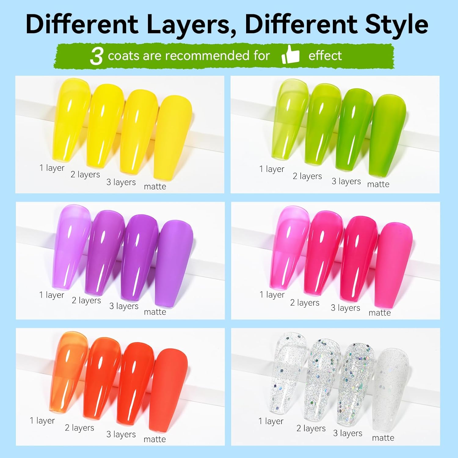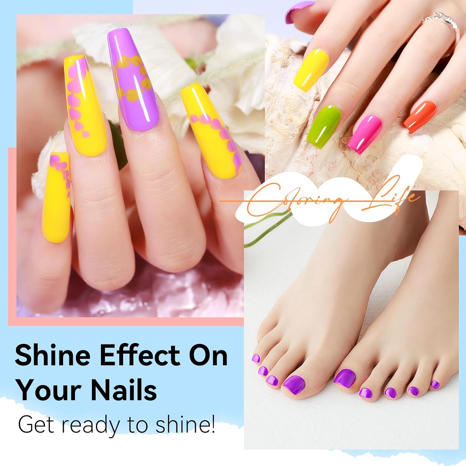 - Bright Trendy Palette: This nail polish set features 6 stunning shades of trendy colors. The well-selected bright color collection of "yellow orange rose pink green purple and glitter silver" is versatile and suitable for any occasion or outfit. From a chic daily look to a vacation style, these shades provide the ideal finishing touch for any summer ensemble.