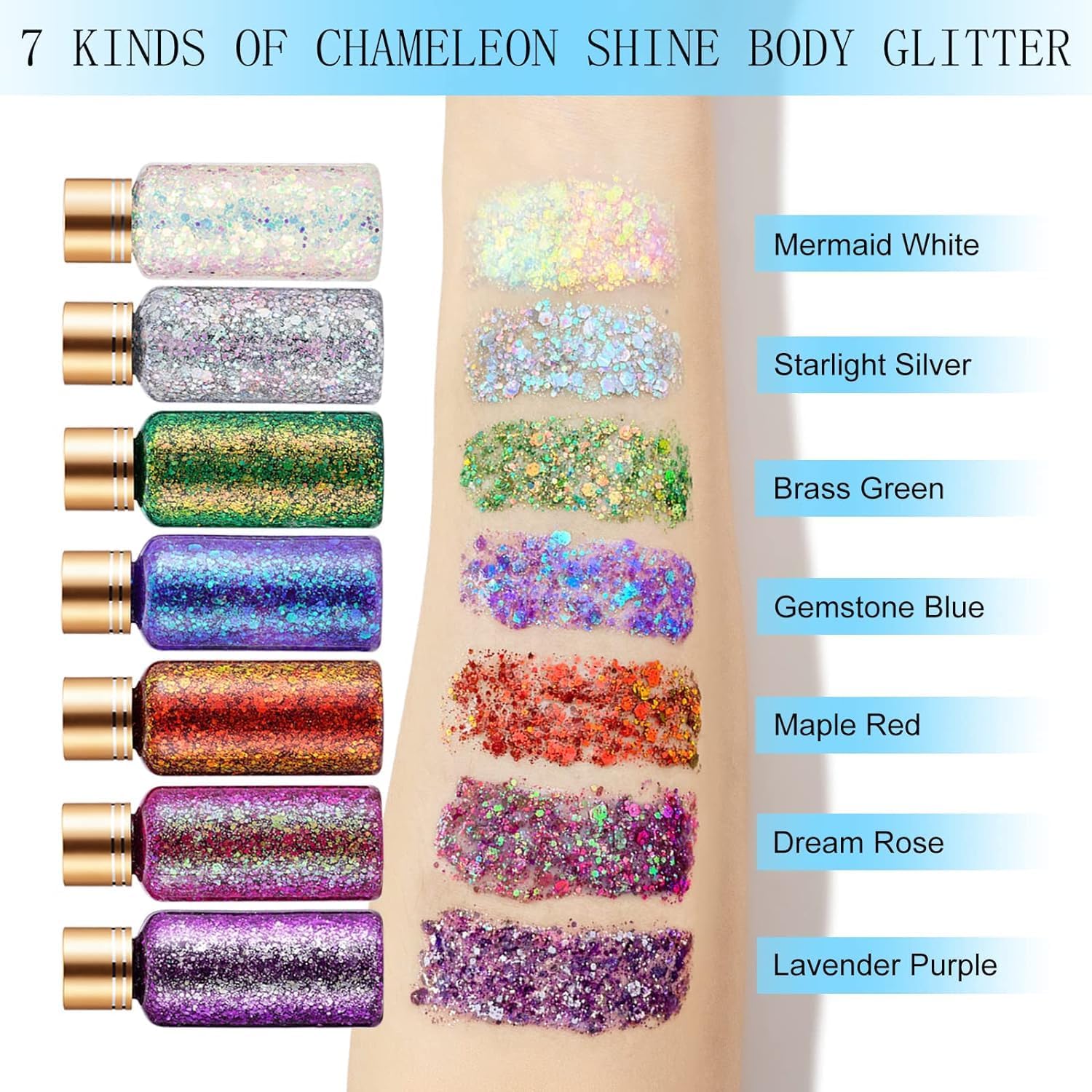 - MULTIPLE COLORS AVAILABLE : Our Holographic chunky Body Glitter contains a variety of colors for you to choose from, including Green Gold, Maple Red, Gemstone Purple, Starlight Silver, Lavender Purple, Dream Rose, Clear White, Cute Pink, Pure Gold, Cool Black and more. It is the ultimate recipe to makeing you the most popular on stage!