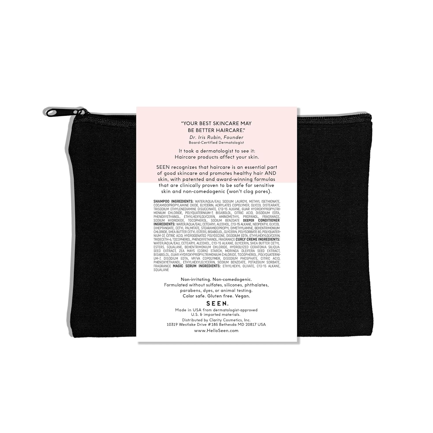 - A dermatologist-developed, vegan, non-comedogenic set for curly hair that features travel-friendly sizes of SEEN Shampoo, Deeper Conditioner, Curly Creme and Magic Serum.