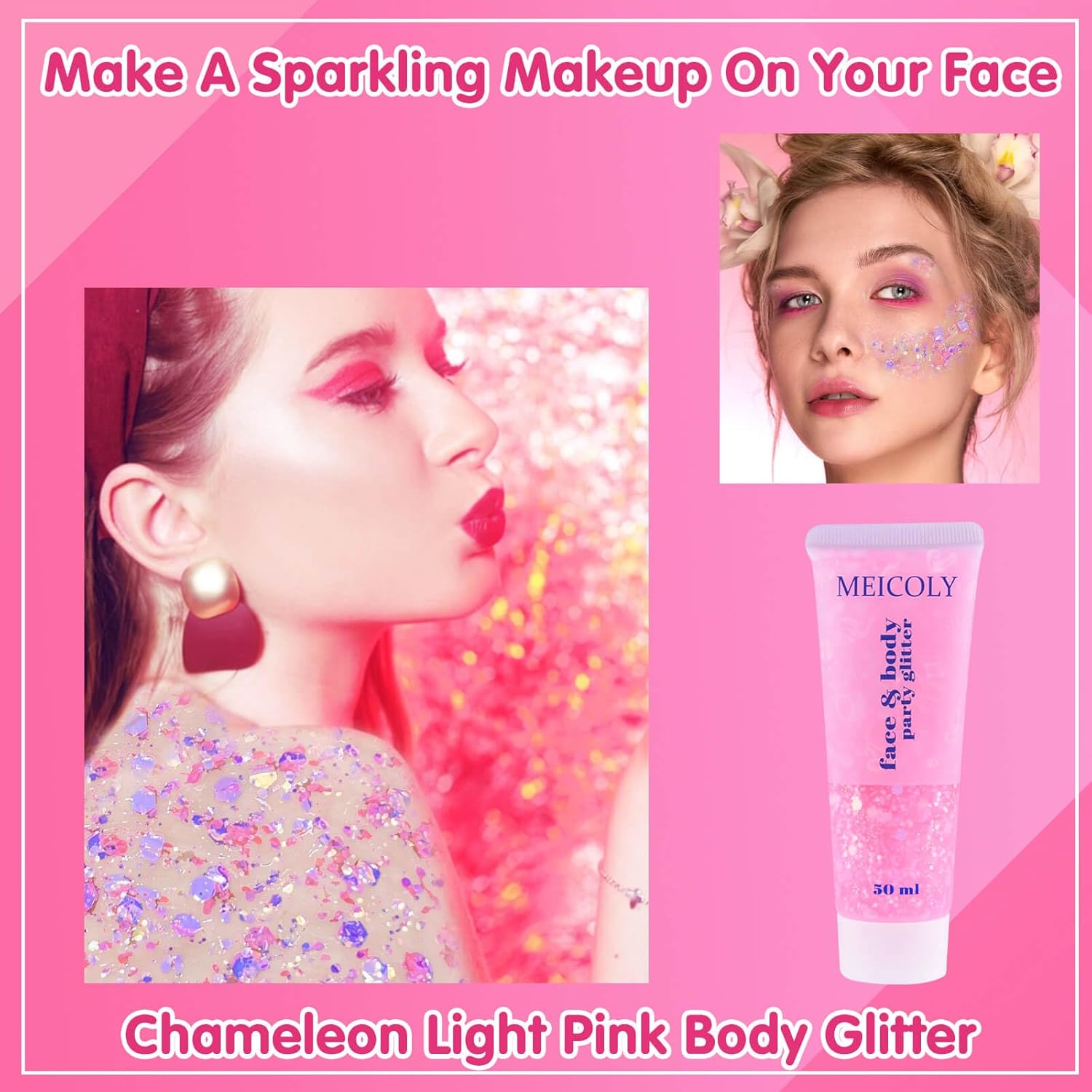 MEICOLY Chameleon Light Pink Body Glitter,Chunky Face Glitter for Halloween,Color Changing Mermaid Face Glitter Gel,Holographic Glitter Sequin for Face Body Hair,Festival Party Cheer Glitter Makeup
