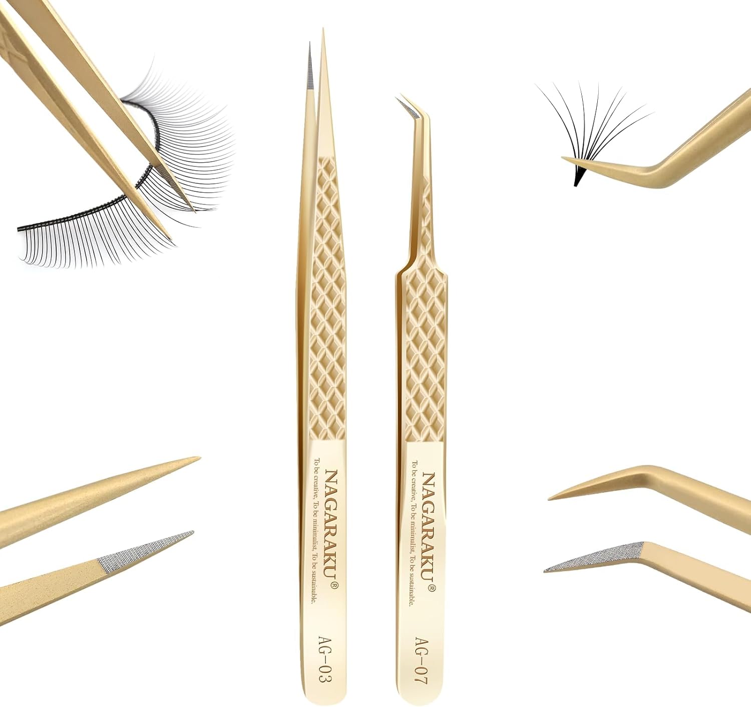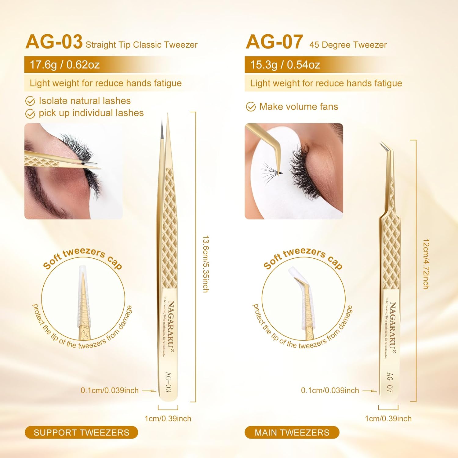 NAGARAKU 1 Pair Precision Fiber Tip Tweezer for Eyelash Extensions Professional Eyelash Tweezers Antistatic Straight & Curved Tip Tweezers with Box(Isolation & Volume Lash Tweezers AG-03 & AG-07)
