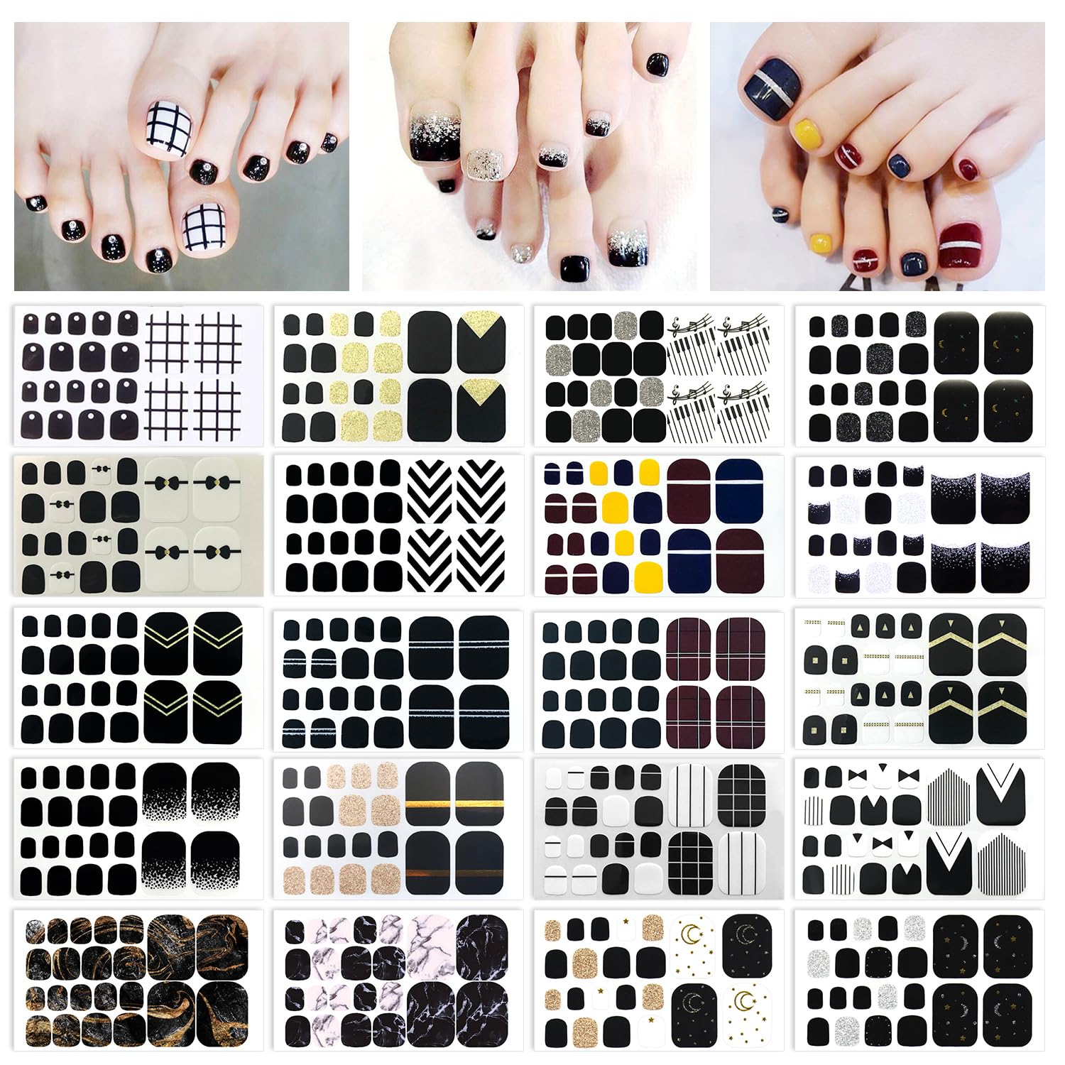 - Luxury Black Style - SILPECWEE toe nail strips have plaid, marble, bowknot, french tip stripe, glitter and gradient nails design, amazing black theme, it make you at any time and on any occasion, you are definitely the most charming one.
