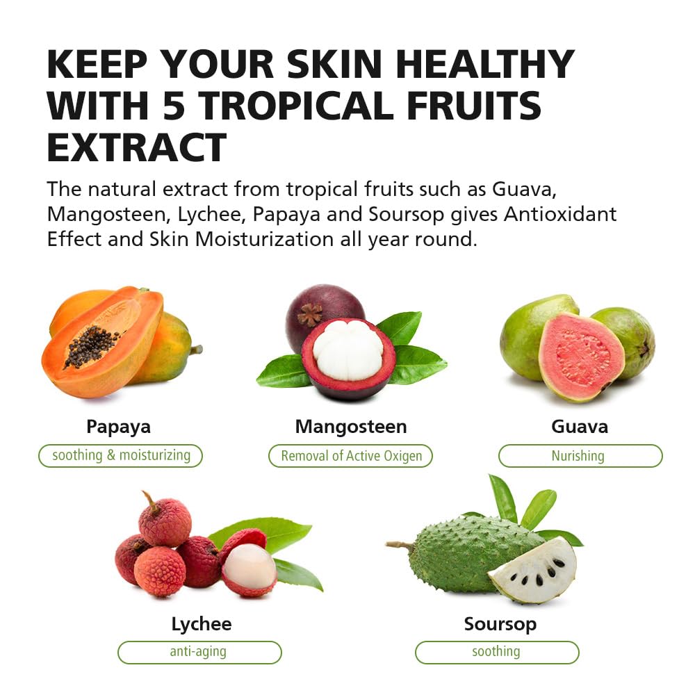 - 🔆ANTIOXIDENT-RICH : Formulated with hyaluronic acid and antioxidants properties from the natural extract from tropical fruits such as Guava, Mangosteen, Lychee, Papaya and Soursop, nourishes and revitalizes the skin to protect your skin from environmental and sun damage all year round.
