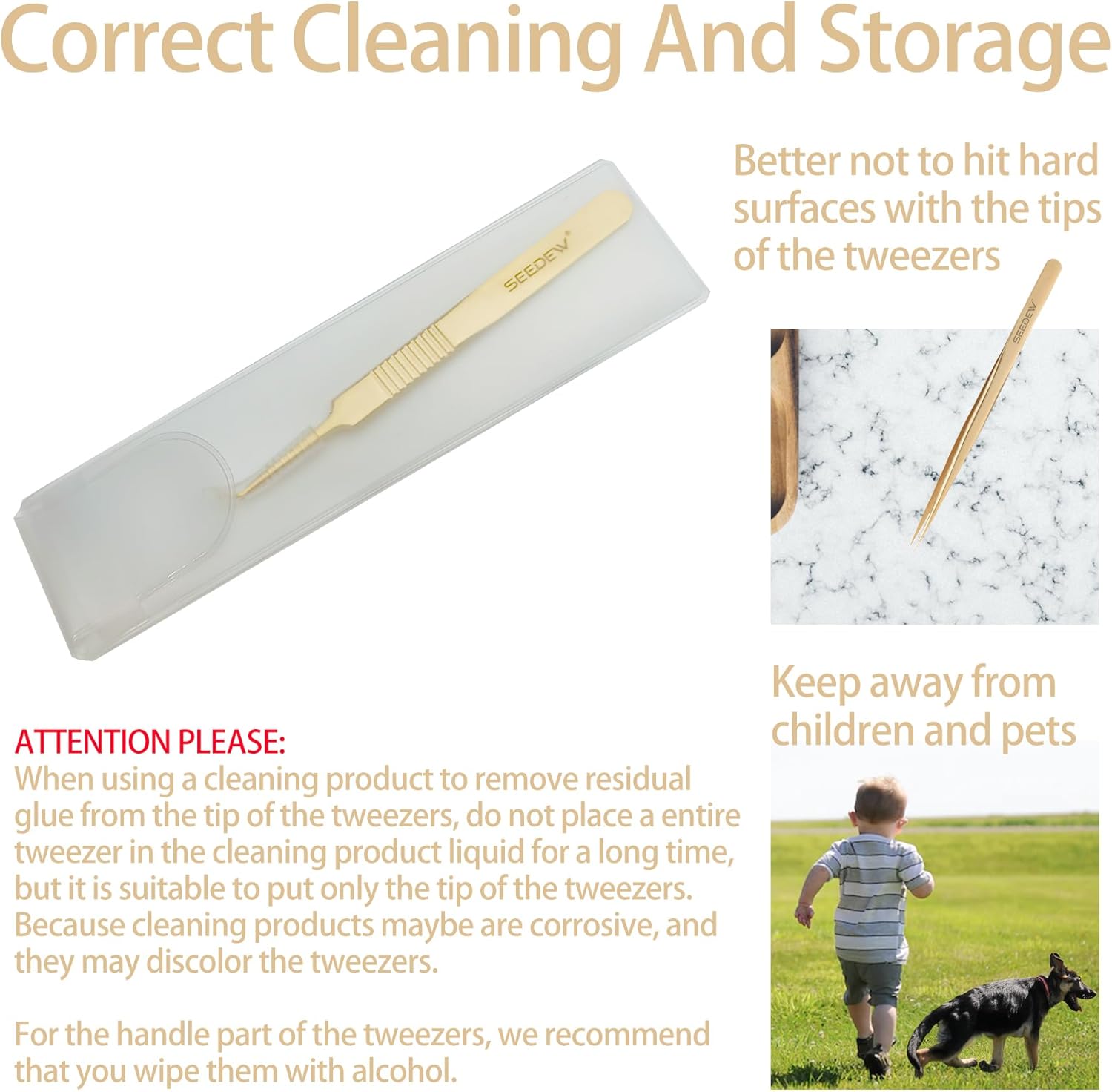 - ⭐【Premium And Classic】SEEDEW stainless steel golden tweezers have texture, smooth surface, classic and elegant style. 1 piece tweezer is equipped with a cover for the tip of the tweezer and a protective case, which is safe for storage, dustproof, dropproof, and imitation of poking.