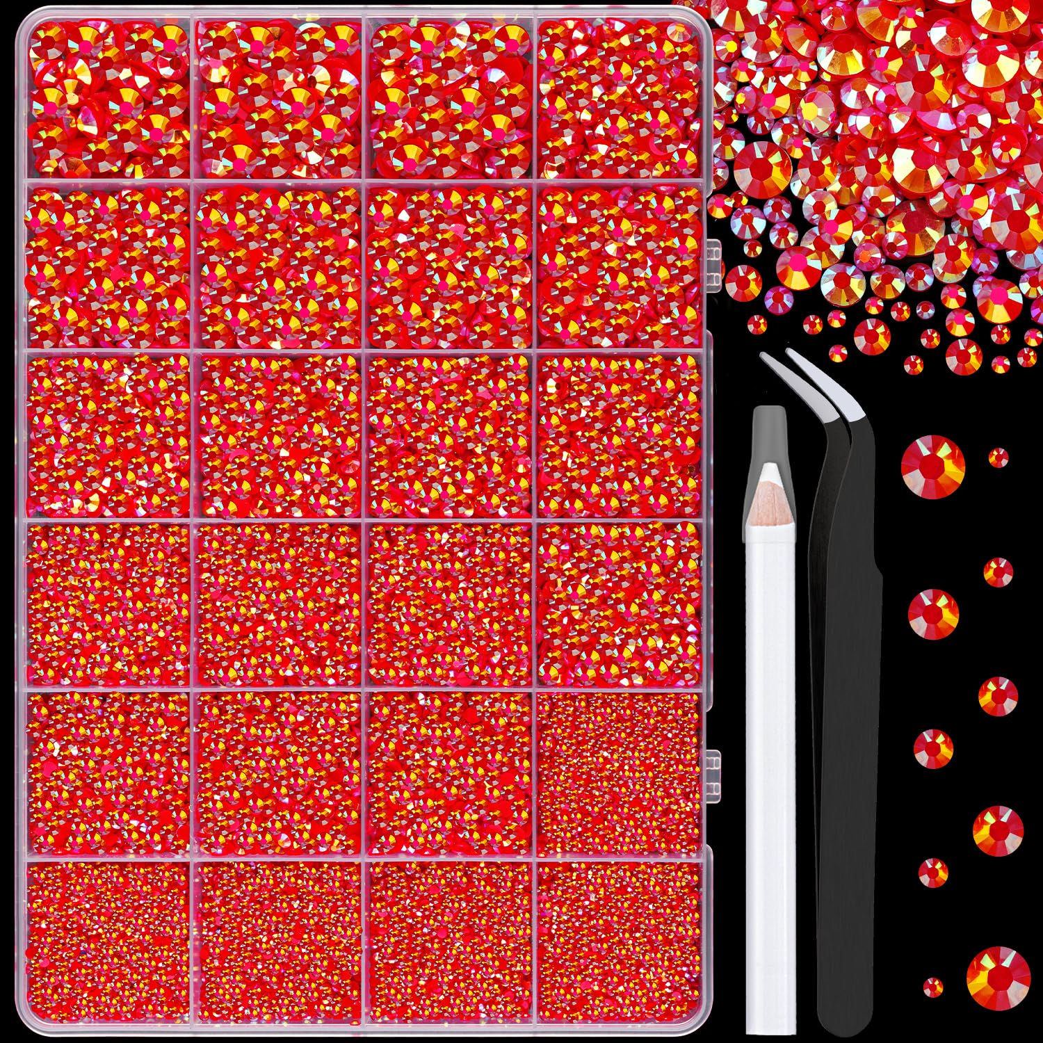 • 💎PACKAGE CONTENT -- The package includes 1 box with 24 grids, featuring a variety of sizes: 2mm x 5 grid, 3mm x 6 grid, 4mm x 5 grids, 5mm x 5 grids, and 6mm x 3 grids, approx. 25000 pcs of 2-6mm bling-out resin rhinestones (Red AB). 1 tweezers and 1 pickup pen are included for easily picking up of rhinestones. The large amount will support you to fulfill a number of your wonderful DIY decoration ideas.