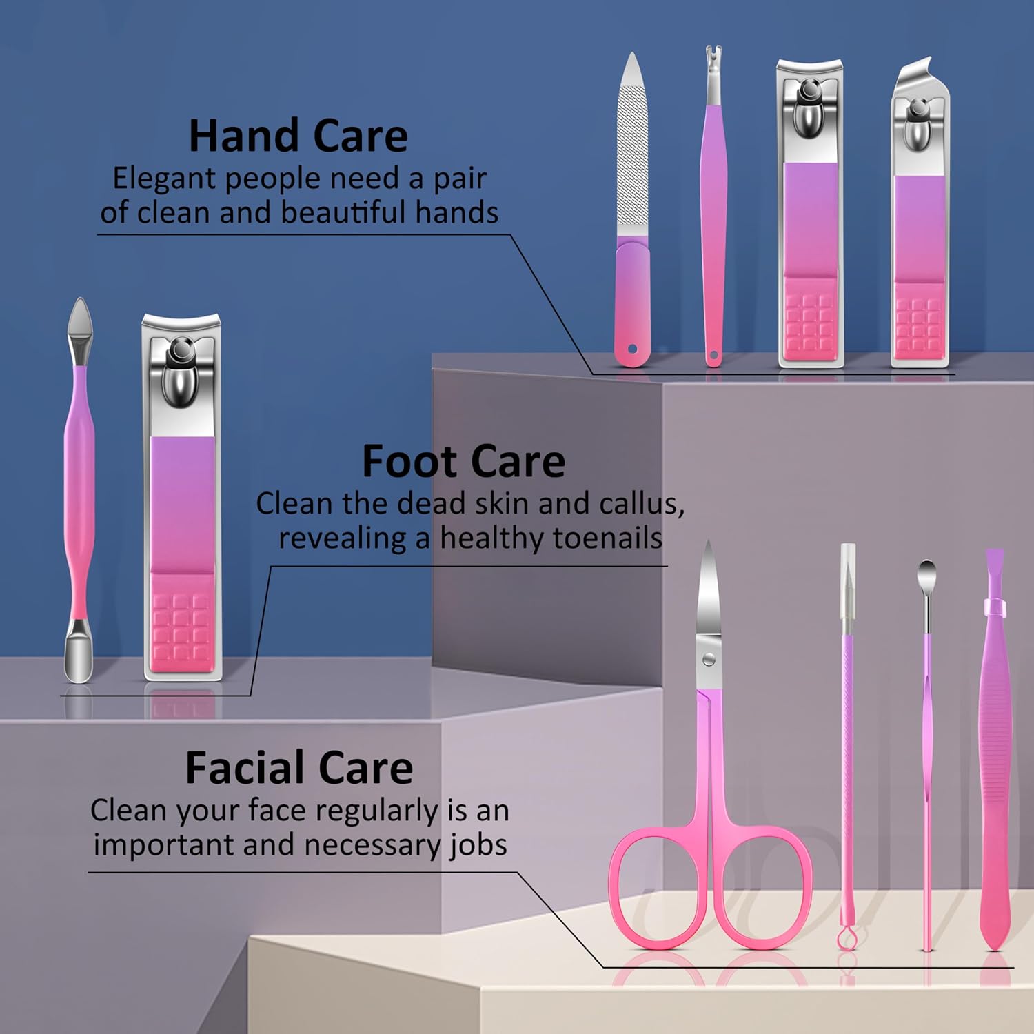 - Manicure Set for Women Men: The manicure pedicure set is available in five colors: black, blue, rose gold, green, gradient pink and purple. This leather manicure kit is the perfect gift for Valentineβs Day, Thanksgiving Day, Christmas Day, Birthday and important anniversary for family and friends.