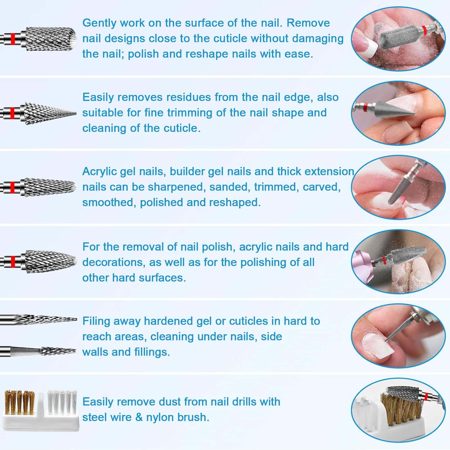 - 【Safety and Easy to Clean Drill Bits】Individual bit is included in a transparent box, so you can take it with you wherever you go. Nail brush bit can easily clean gel dust on the drill, rinse or brush the dust and powder on the bit after each use, then you can continue to use, Protect your skin from being harmed with superior craftsmanship and well-tested design