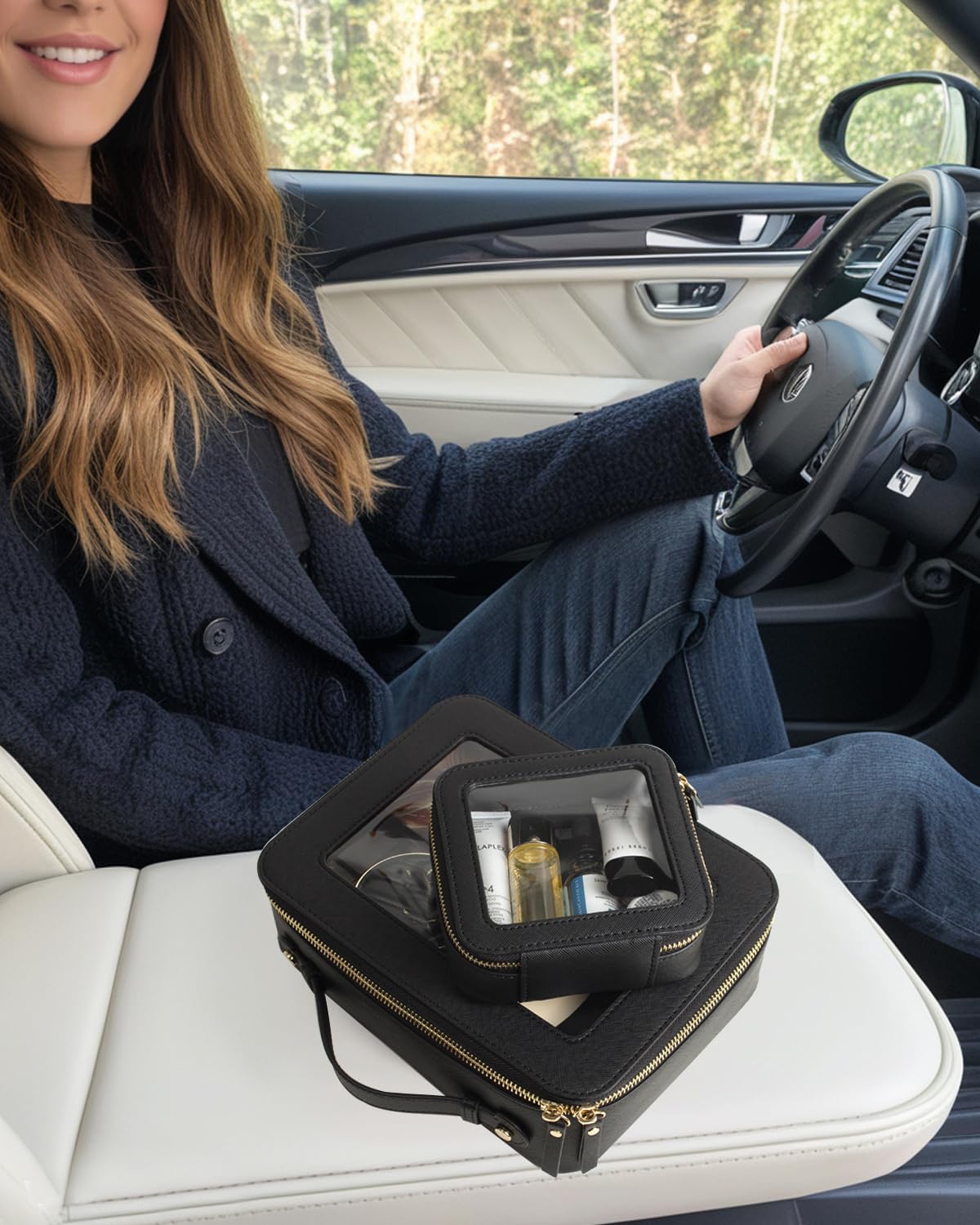 - Clear Design: Our clear toiletry bag set is sleek and minimalistic look for your makeup accessories collection. And is designed with a clear PVC window,all items are clear at a glance, and you can quickly choose the cosmetics you need. Large: 9.44“ x 6.1” x 2.7”, Mini: 5'' x 4.7'' x 2''