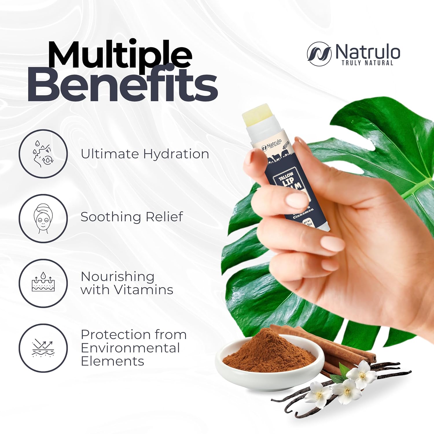 - INTENSELY HYDRATING FORMULA: Immerse your lips in moisture with our grass-fed organic beef tallow lip balm with vanilla cinnamon flavor. Crafted with natural fats, akin to those in human skin, it maintains your lips' moisture barrier for enduring hydration and velvety softness.