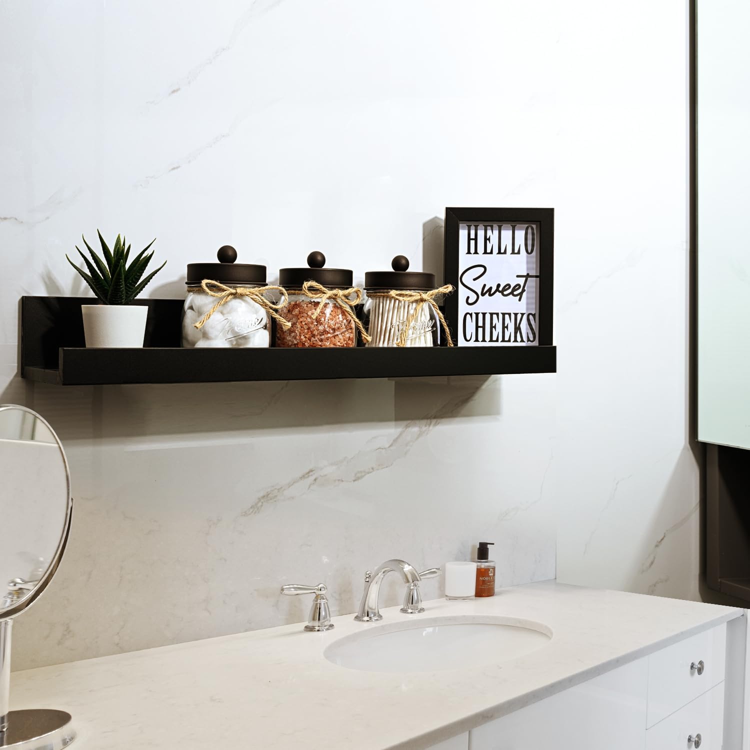 - πElegant and Cute Bathroom Decor: Add charm to your bathroom with this glass bathroom mason jars set! Perfect accent to bathroom shelving, bathroom countertop, makeup vanity, carft room, black and white accented bathroom, and guest bathroom. Ideal for home decor, this collection embodies a variety of styles including rustic, western, farmhouse, and contemporary designs. It is particularly well-suited for bathroom decor and offers a versatile aesthetic that complements both traditional and modern interiors.