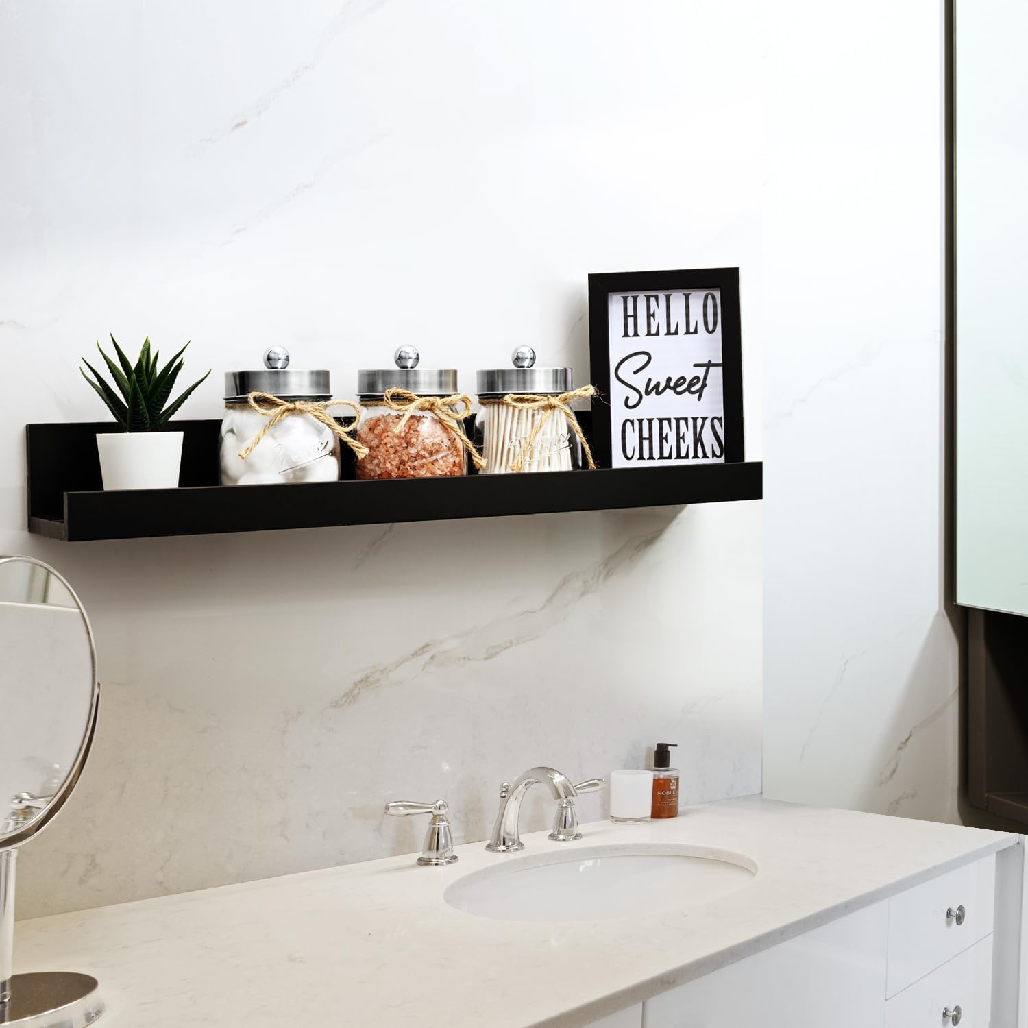 - πElegant and Cute Bathroom Decor: Add charm to your bathroom with this glass bathroom mason jars set! Perfect accent to bathroom shelving, bathroom countertop, makeup vanity, carft room, black and white accented bathroom, and guest bathroom. Ideal for home decor, this collection embodies a variety of styles including rustic, western, farmhouse, and contemporary designs. It is particularly well-suited for bathroom decor and offers a versatile aesthetic that complements both traditional and modern interiors.