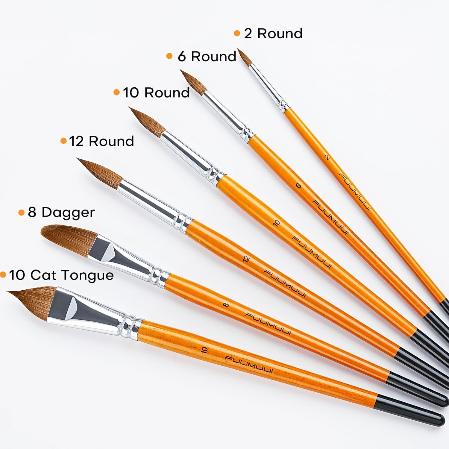 - Professional Sable Watercolor Brushes Set - Wide variety of shapes and sizes for various watercolor art techniques from precise detail to large washes; Fine tipped Rounds #2 #6 #10 #12; Cat's Tongue(Oval Wash) #10; Dagger #8.