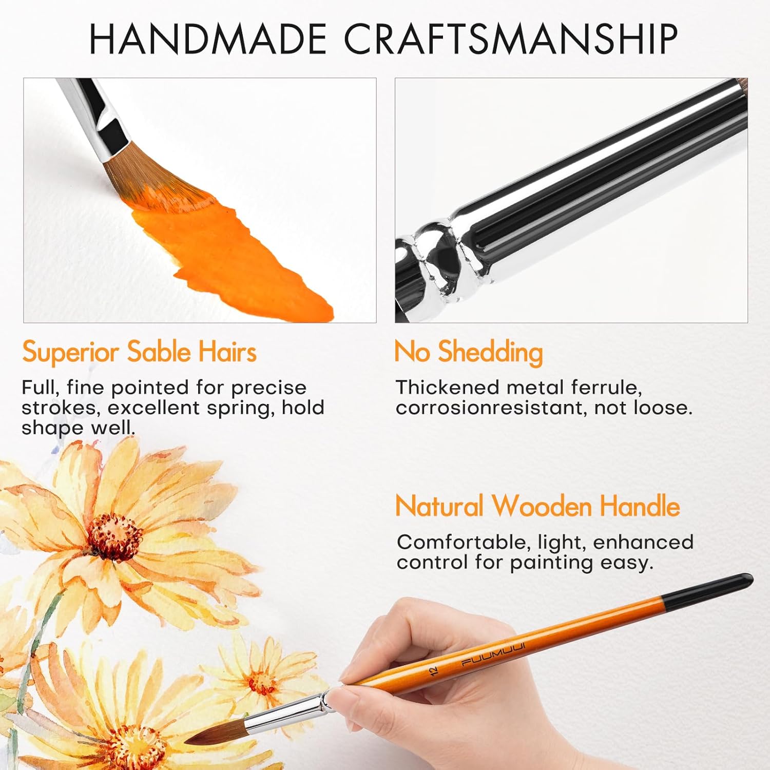 - Consistent Flow Control - Superior Kolinsky sable hairs have great liquid holding capacity and ensure smooth paint flow; the color flows evenly and consistently from the point with enough color carry capacity within the belly of the brush to lay down a flowing gestural stoke of colour, soft and smooth sable hair gives you spring back and be able to hold its shape.