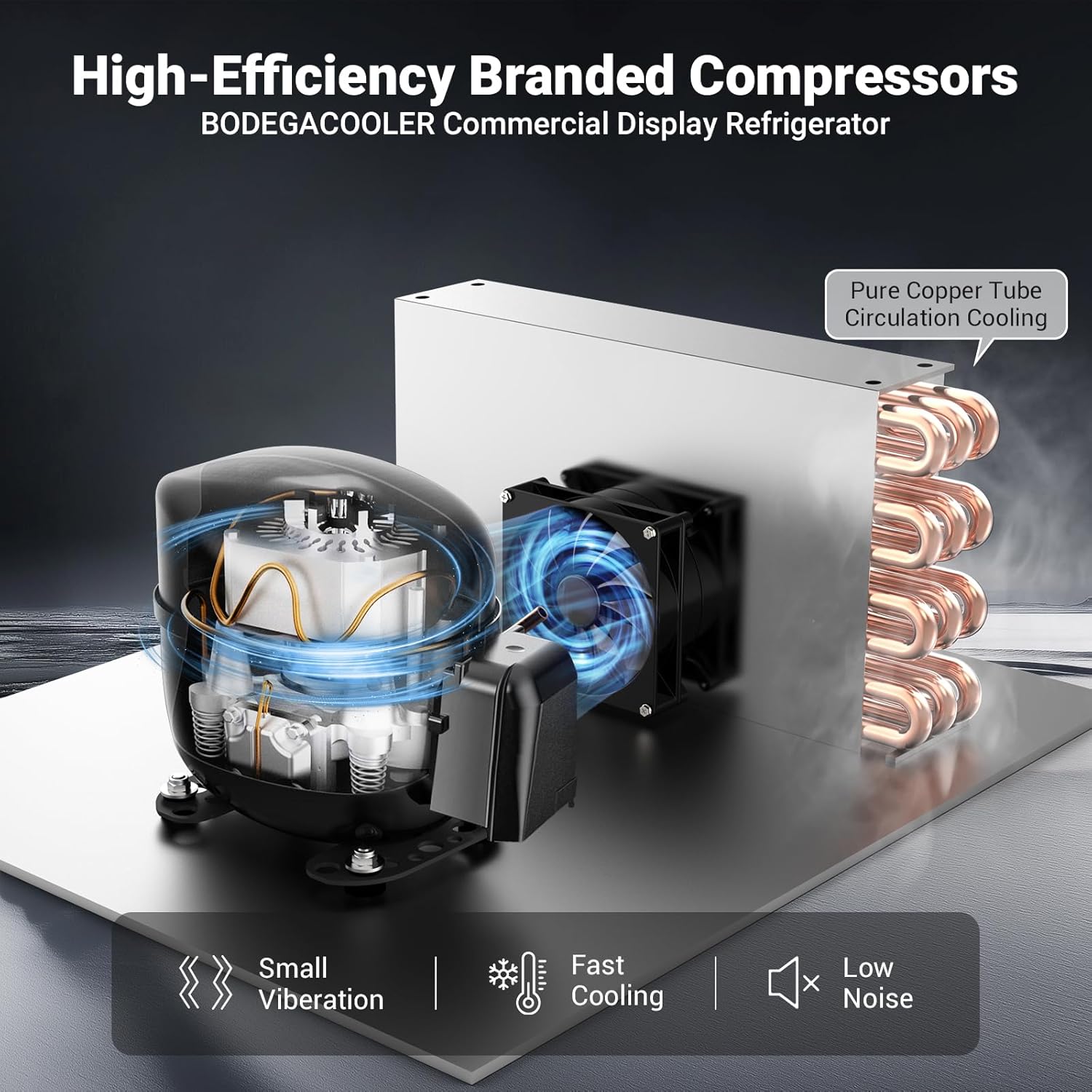 - 【Efficiently Insulated Display Refrigerator】 BODEGACOOLER commercial beverage refrigerator is equipped with double-thickness glass door, using materials with UV and heat insulation function, effectively blocking UV and heat, greatly saving energy. Meanwhile, the internal thermostat system complements the powerful cooling circulation system, solving the trouble of water droplets generated by condensation inside the commercial refrigerators glass door refrigerator.