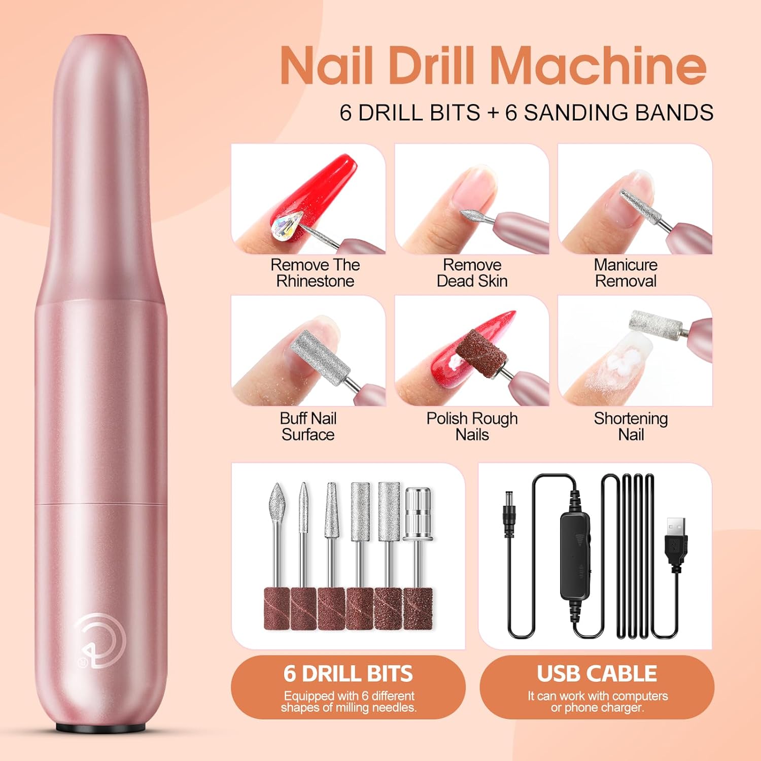 - ❤Upgraded Nail Drill:This nail drill kit includes 1 nail drill, 6 drill bits, 6 sanding bands, and 1 USB cable. The professional nail drill is upgraded, it's powerful motor, low noise and vibration, more stable, more multiple nail drill bits for multifunction, compact size and more convenient to carry. The 6 different drill bits have multiple uses, can be used for grinding, cutting, polishing, and so on, and can help you prepare nails and remove manicures more safe, efficiently and fast.