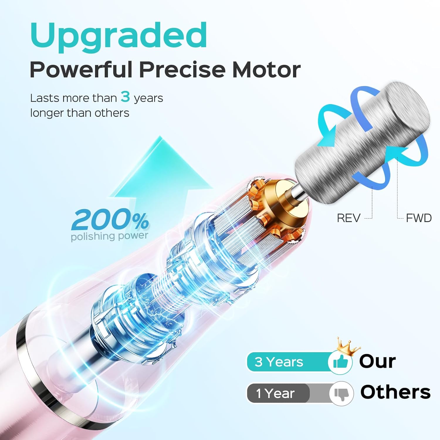 - 3 Years More Durable: The upgraded nail file set has a service life of more than 3 years, polishing efficiency increased by 200%.More powerful motor and shock-absorbing bearings, making it more durable, low vibration, low heat and low noise (οΌ40dB), improving the comfort during use and making you fall in love with manicure.This nail file comes with a nail drill and grinding belt to meet your multiple manicure needs