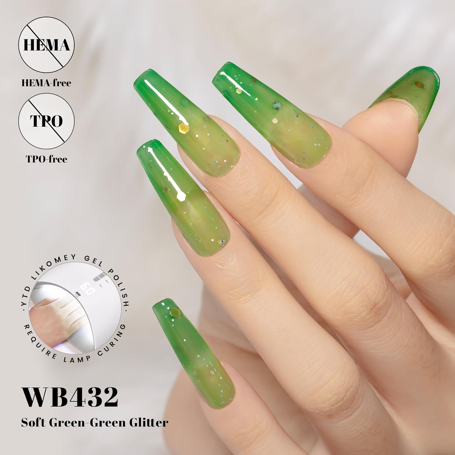YTD Likomey Color Changing Gel Nail Polish,15ml Grass Green To Bright Green Shimmer Glitter Mood Temperature UV Gel,Fall Winter Yellow Thermal Ombre UV Color Nail Varnish,HEMA Free WB432