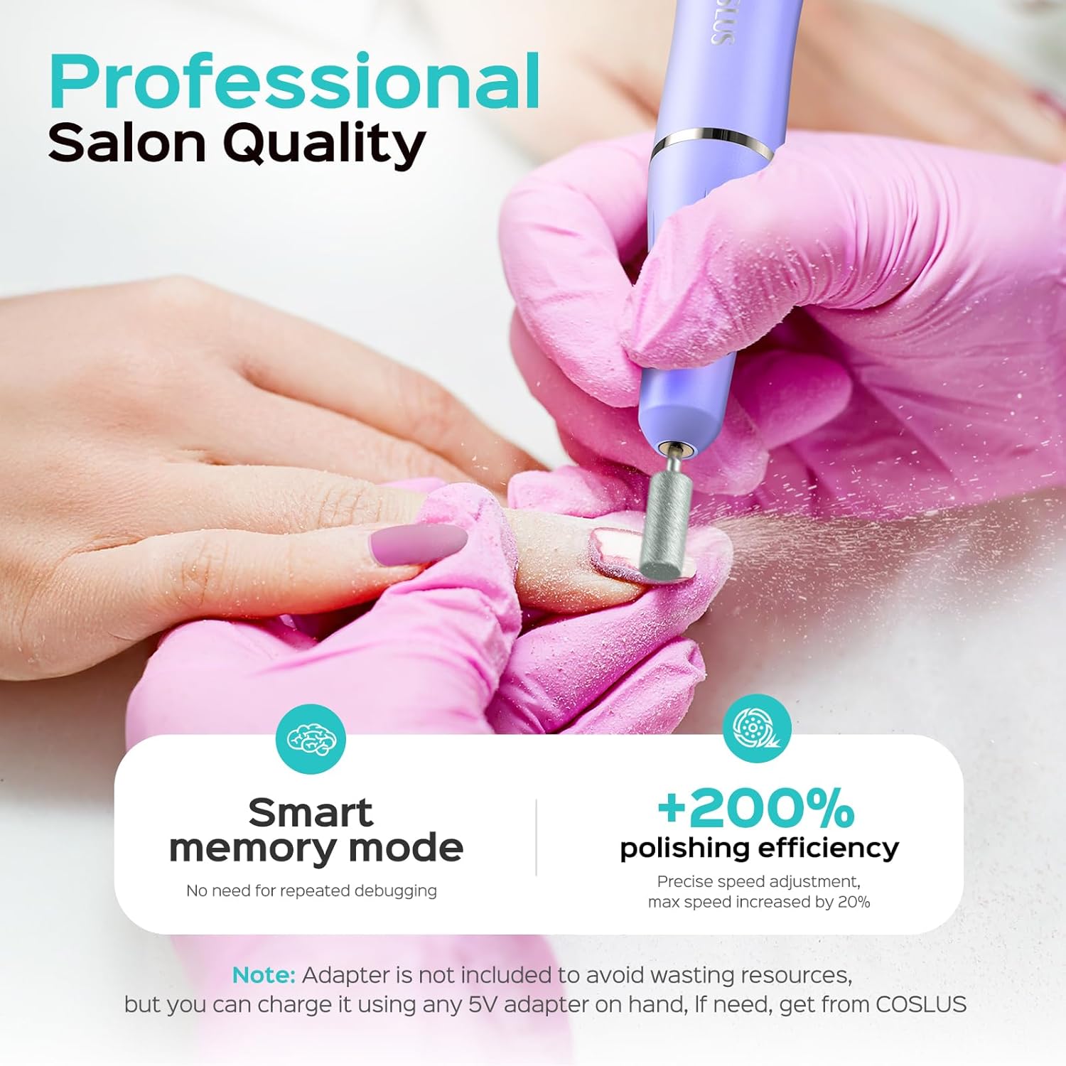 COSLUS Cordless Electric Nail Drill File: Nail Drill Machine with Stepless Speed Knob for Acrylic Gel Dip Powder Polish, Professional Portable Manicure Pedicure Rechargeable for Home Salon Use Purple