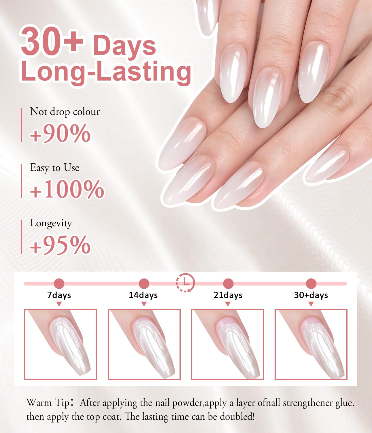 - Amazing Glazed Donut Effect: Compared with other pearl powders, BISHENGYF white chrome nail powder more brighter and shinier. Different base color different effect. It makes your nails look glittery, show elegant and stunning. And this glittery effect lasts for more than 30+ days.
