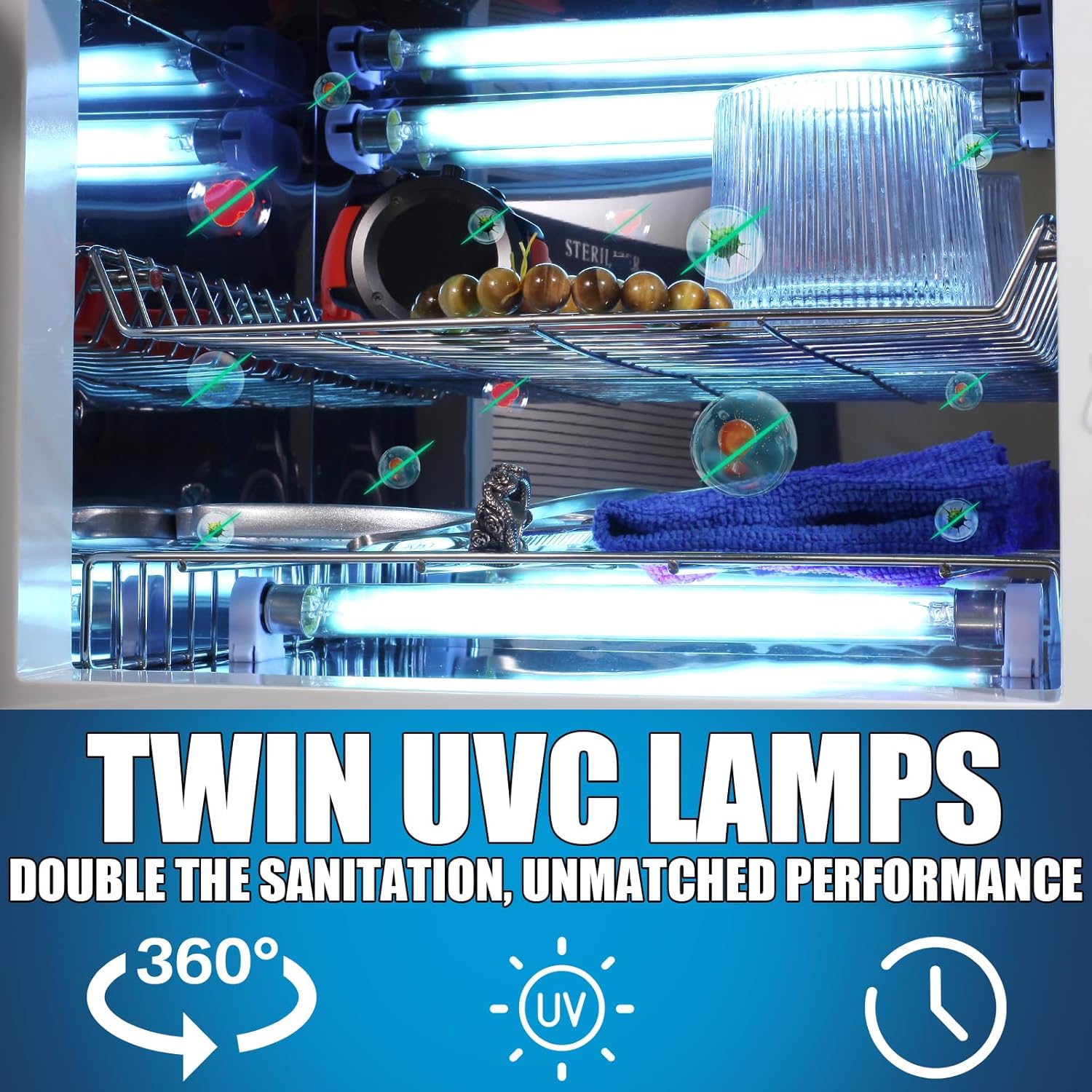 - High-Performance UV and Ozone Disinfection: Harnessing the power of 253.7nm ultraviolet light combined with ozone, our cabinet provides a dual-action cleaning that effectively eliminates bacteria and viruses. The spacious storage and dual lamp technology guarantee comprehensive cleaning, making it an essential tool for maintaining a clean and healthy environment in your home or professional space.