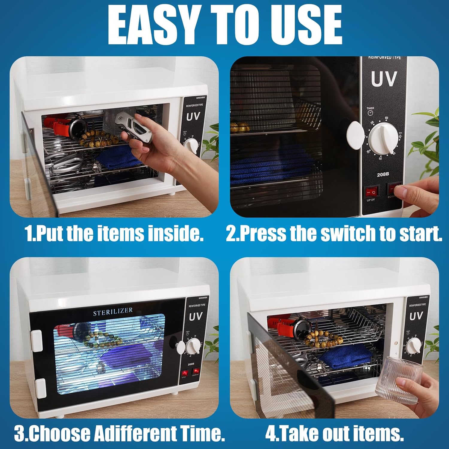 - Safe Operation with UV Light Barrier: Designed with your safety in mind, our cabinet's door is treated to block most UV light, ensuring your eyes and skin are protected from direct exposure. This feature allows for a safe sanitizing process without compromising your health.