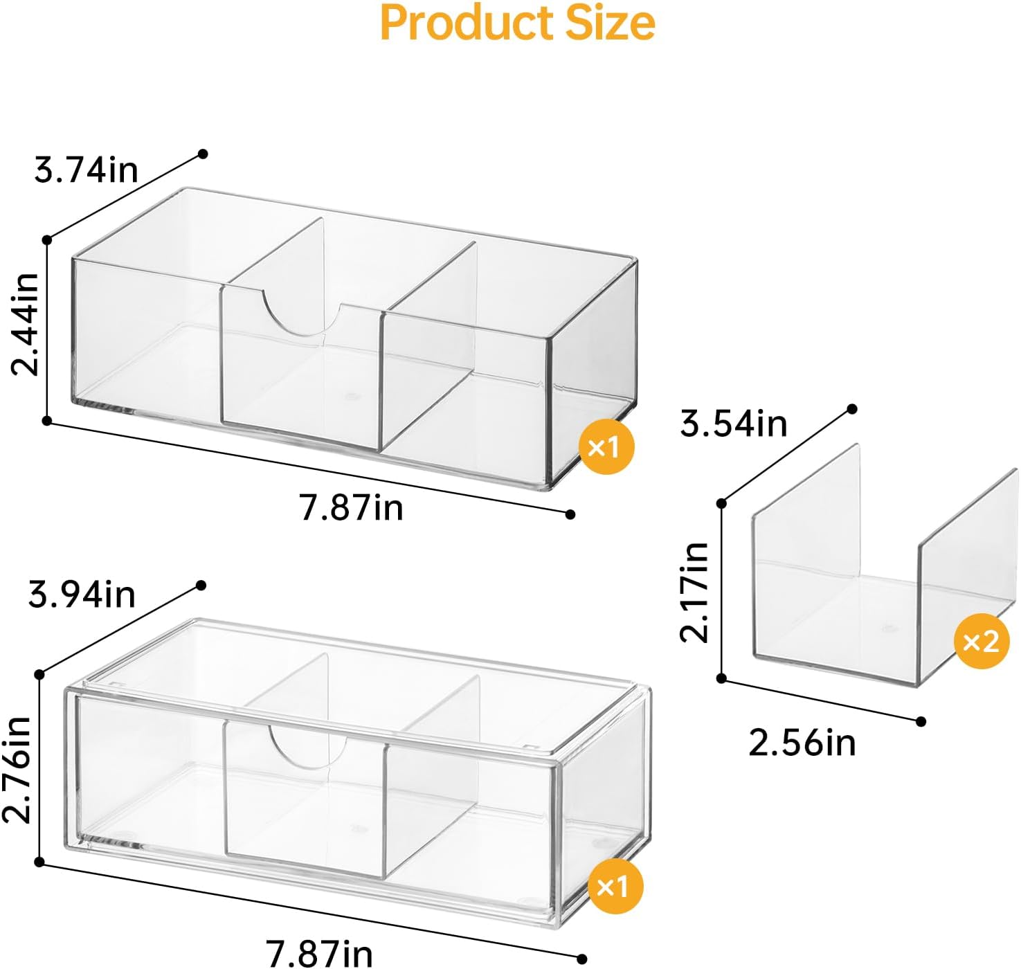- Item Details: This 2 tier medicine cabinet organization set includes top clear compartment box Γ1, size: 7.87Γ3.74Γ2.17 in; and bottom clear drawer compartment box Γ1, size: 7.87Γ3.94Γ2.76in; also comes with two adjustable compartmentalized tier pieces