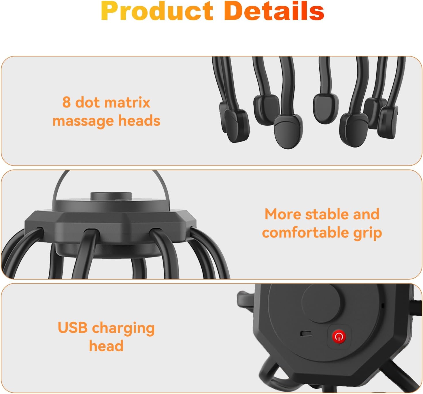 - 360Β° SCALP RELAXATION, FULLY RELAXING: Experience a Realistic Massage with our 360Β° simulated human finger kneading head massager, designed to relieve scalp stress and promote relaxation. The 12 prongs gently stimulate your scalp, relieving stress and promoting better sleep. Soft rubber beads enhance the soothing experience, leaving you feeling rejuvenated.
