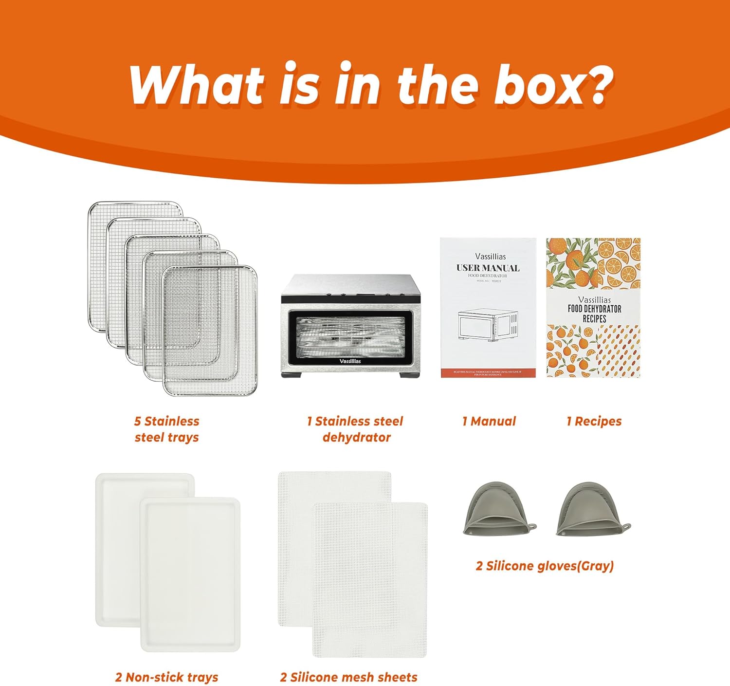 - WHAT'S IN BOX - Included 1 stainless steel dehydrator, 5 stainless steel trays, 2 silicone mesh trays for drying fine foods, 2 trays for catching water or making fruit roll-ups, 2 silicone gloves, 1 recipes and 1 manual