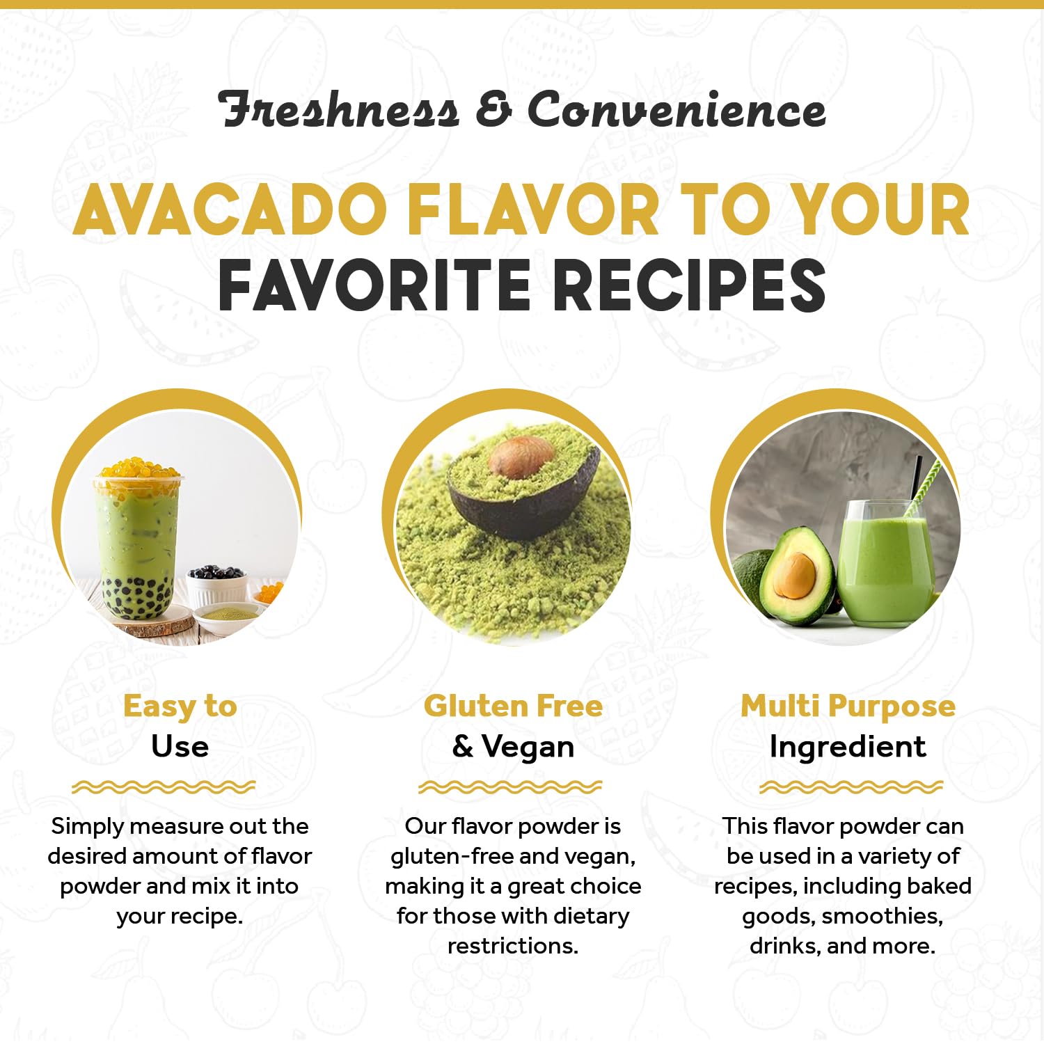 - ๐ ๐ซ๐๐ฌ๐ก๐ง๐๐ฌ๐ฌ & ๐๐จ๐ง๐ฏ๐๐ง๐ข๐๐ง๐๐ ๐ข๐ง ๐๐ฏ๐๐ซ๐ฒ ๐๐ฌ๐: The resealable bag that our Avocado Bubble Tea Flavoring Powder comes in makes it easy to store and use. You can keep it in your pantry or kitchen cabinet and pull it out whenever you want to add some nutty Avocado Bubble Tea Flavoring Powder to your creations.