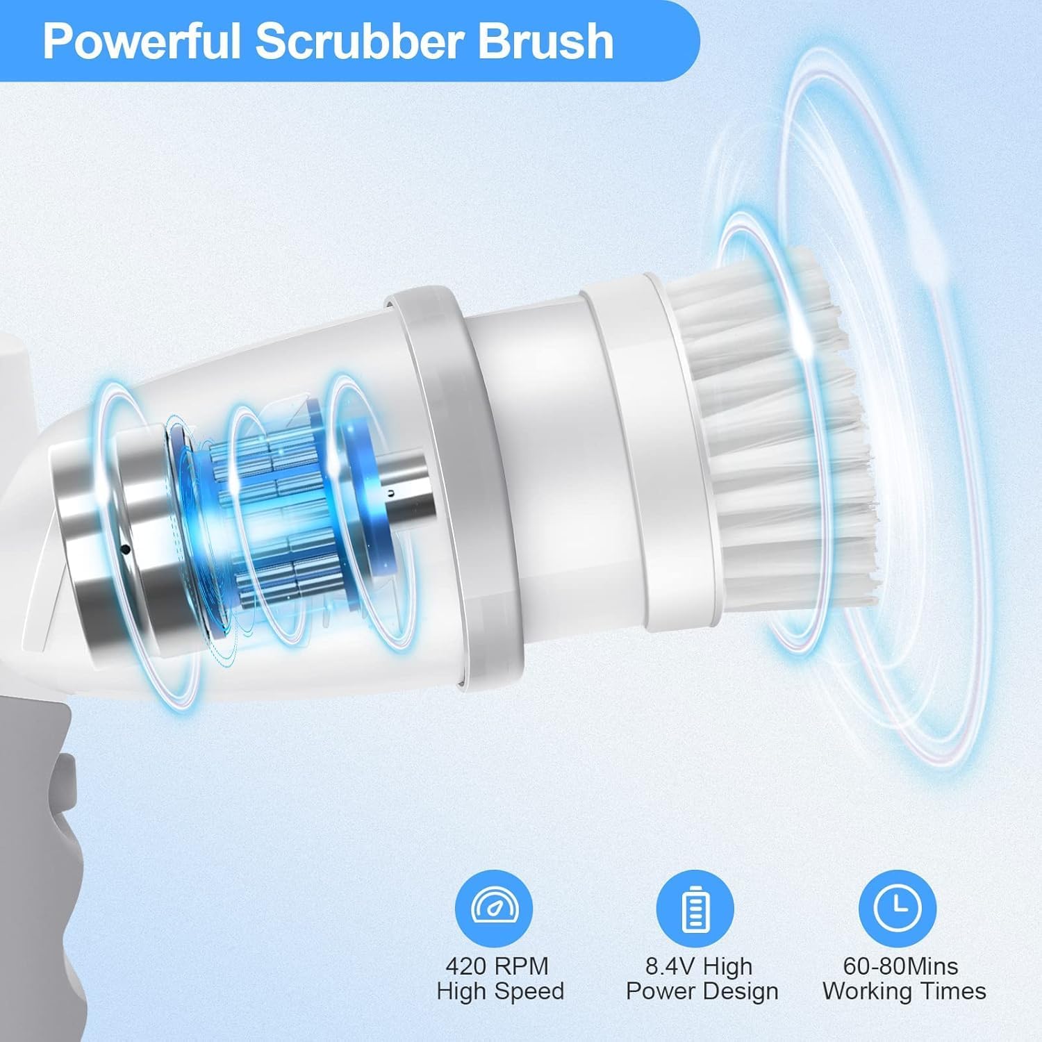 - 【Powerful & Efficient Cleaning】The electric spin scrubber's robust internal motor drives the brush head to rotate at an impressive speed of up to 420RPM, this powerful performance allows it to effortlessly tackle stubborn grime and dirt on a variety of surfaces, including shower stalls, bathtubs, stone tile floors, grout lines, and even toilets. With its high-speed rotation, this electric spin scrubber penetrates deep into tough stains, ensuring a thorough clean that saves you time and effort.