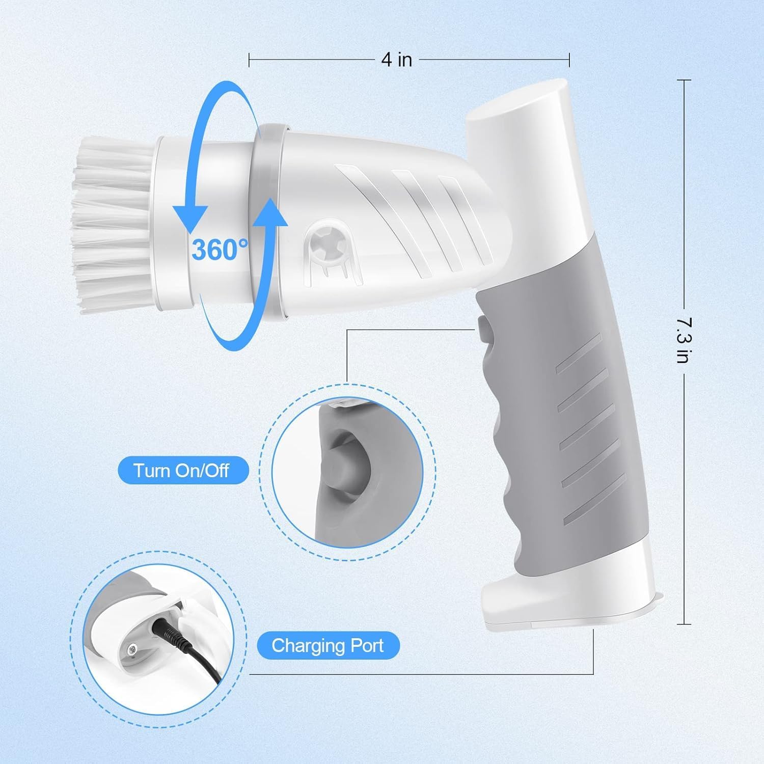 - 【Sturdy Bristles & IPX6 Waterproof】This scrubber’s bristle is made of durable PP material, ensuring effective cleaning of stubborn stains without scratching your surfaces. The brush is highly sealed to protect damage from water, You can wash the brush head directly in the water. Notice: Do not use brushes under water.