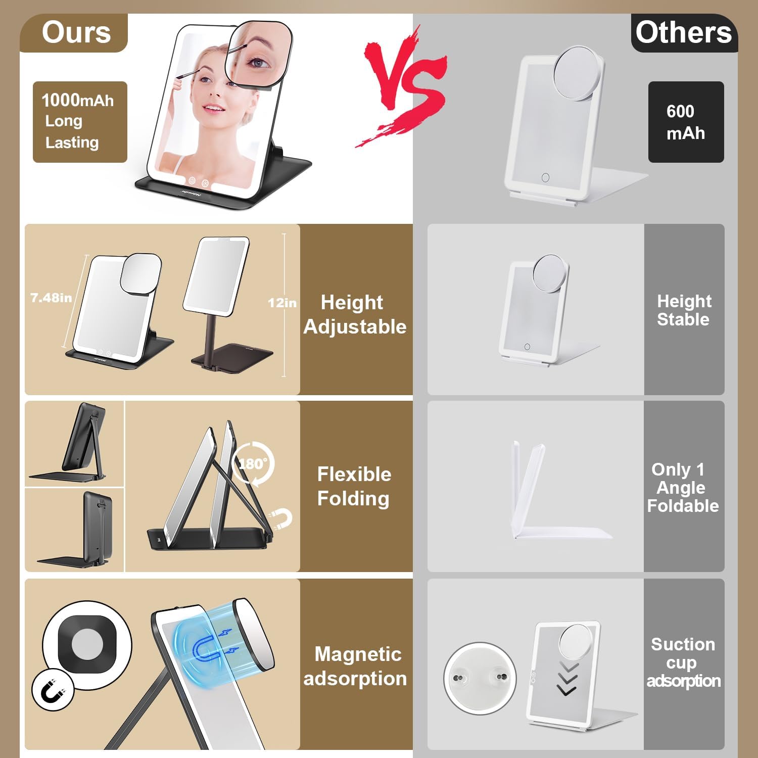 - 👍【Tripple Folding & 180° Adjustable with Angle Sensor】The scientifically designed 180° rotatable and back and forth movable adjustable base can be adjusted in height and angle according to the usage demand. Auto Turn on when angle >30°, turn off when angle <30°. When there is no operation for 30 minutes, the mirror will automatically switch off to save power. Memory function: it will automatically restore the last light mode.