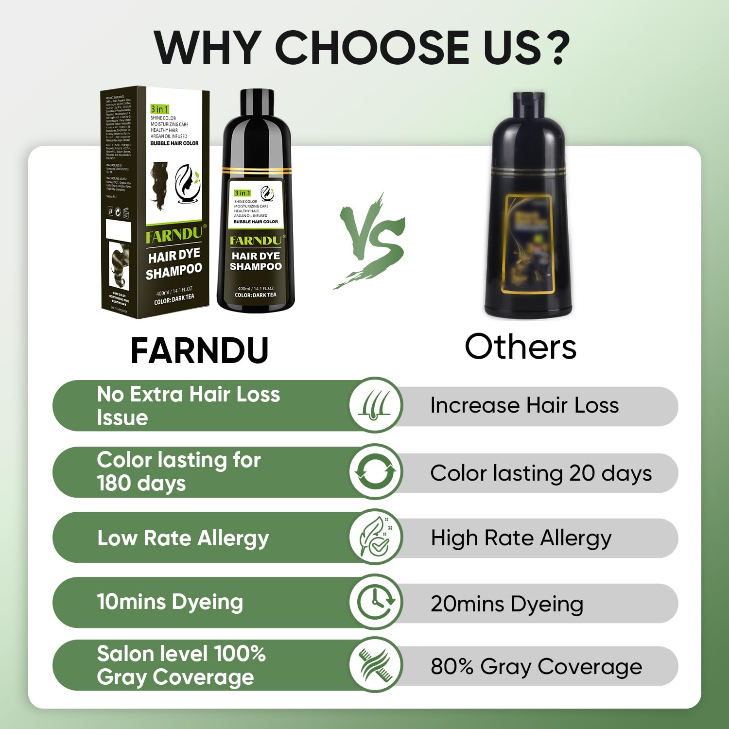 - GRAY HAIR COVERAGE SHAMPOO β Obtain back the fresh-looking hair of your younger days, get back the lost luster, and replenish the health of your weak strands with FARNDU black hair color shampoo for gray hair. Formulated to help you achieve vibrantly colored locks, this hair color shampoo dye will treat your hair with a special combination of active botanicals.