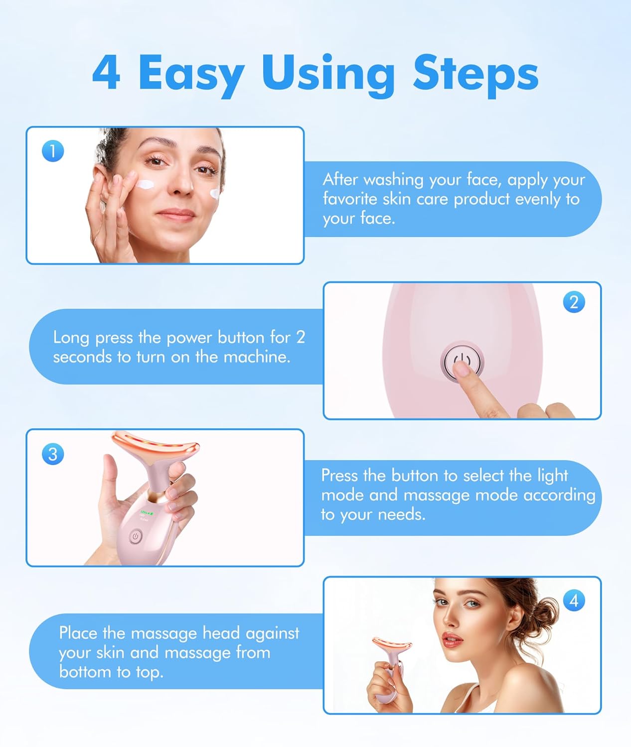 - How to Use: Cleanse the face and apply some skincare products before use. Remove the cap, long press the button to power on and select the mode you need. It is recommended to use it once or twice a day for five to ten minutes each time