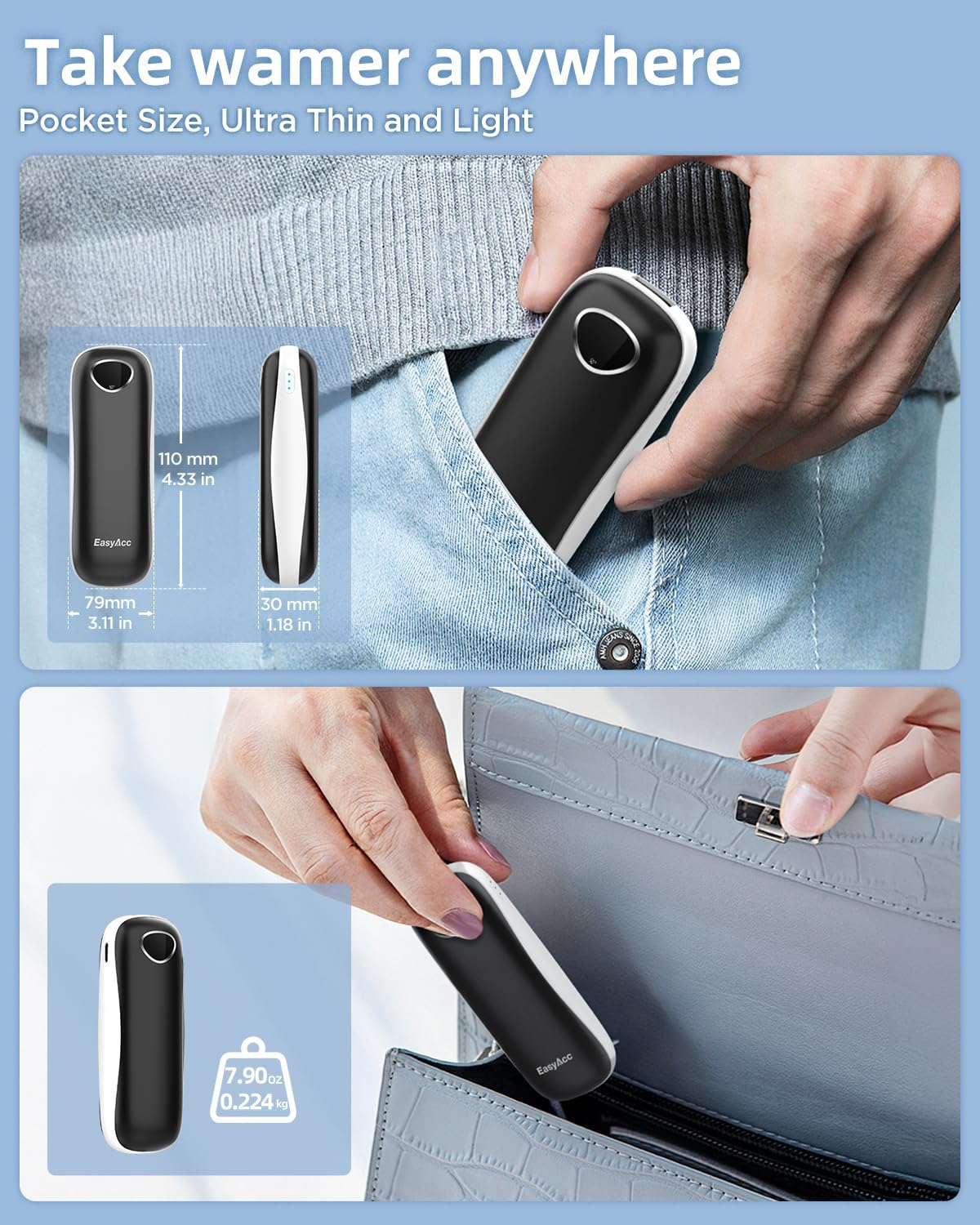 • 【The Palm-Friendly Design】: After 3 years of research, EasyAcc launched the most suitable hand warmers rechargeable for palm grip, perfect fit in the palm of your hand, Ergonomic design is comfortable to hold. The perfect winter companion for you and your Lovers!