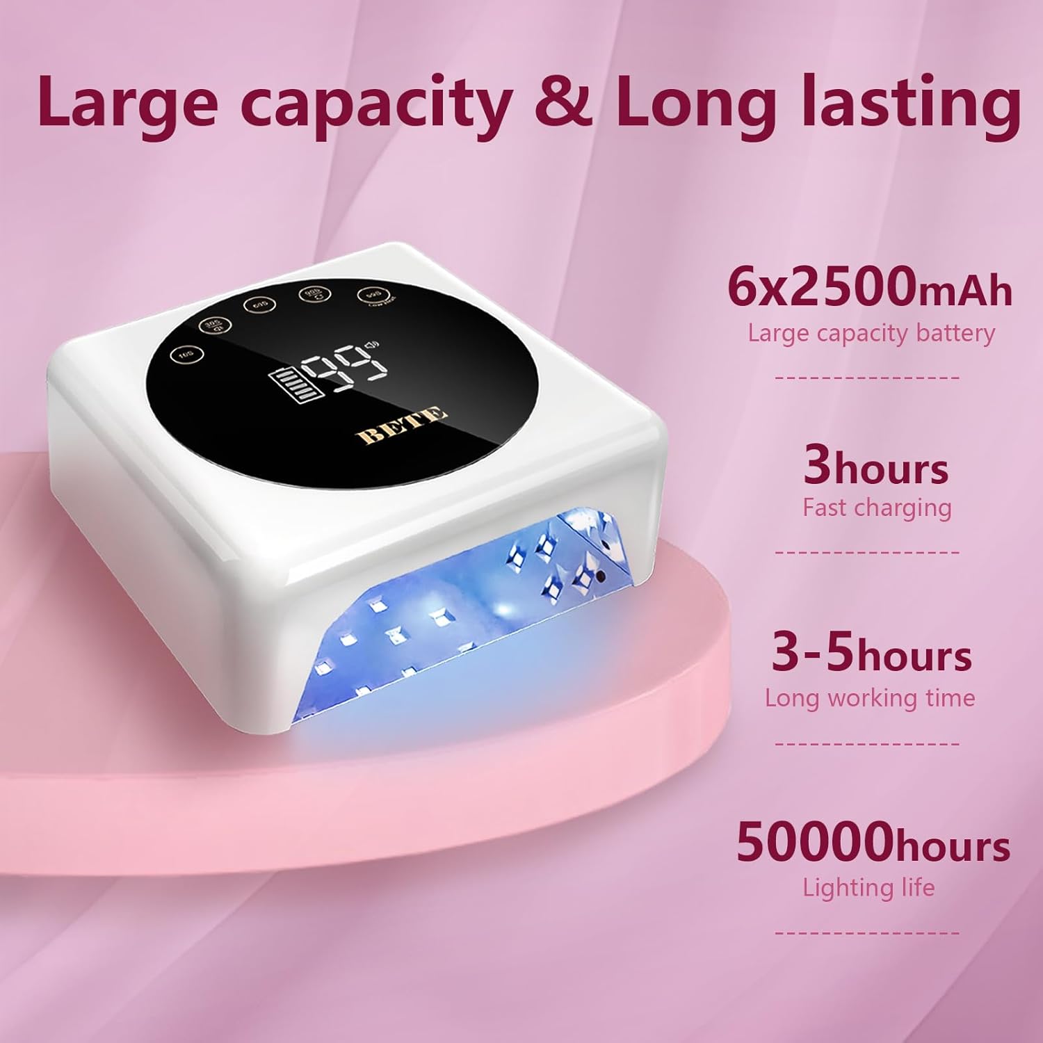 - 【Rechargeable & Cordless】BETE cordless LED nail lamp has a built-in rechargeable 6x2500mAh durable battery that can be charged for 3 hours and use for 3-5 hours. Rechargeable and cordless design that makes you can enjoy it anywhere