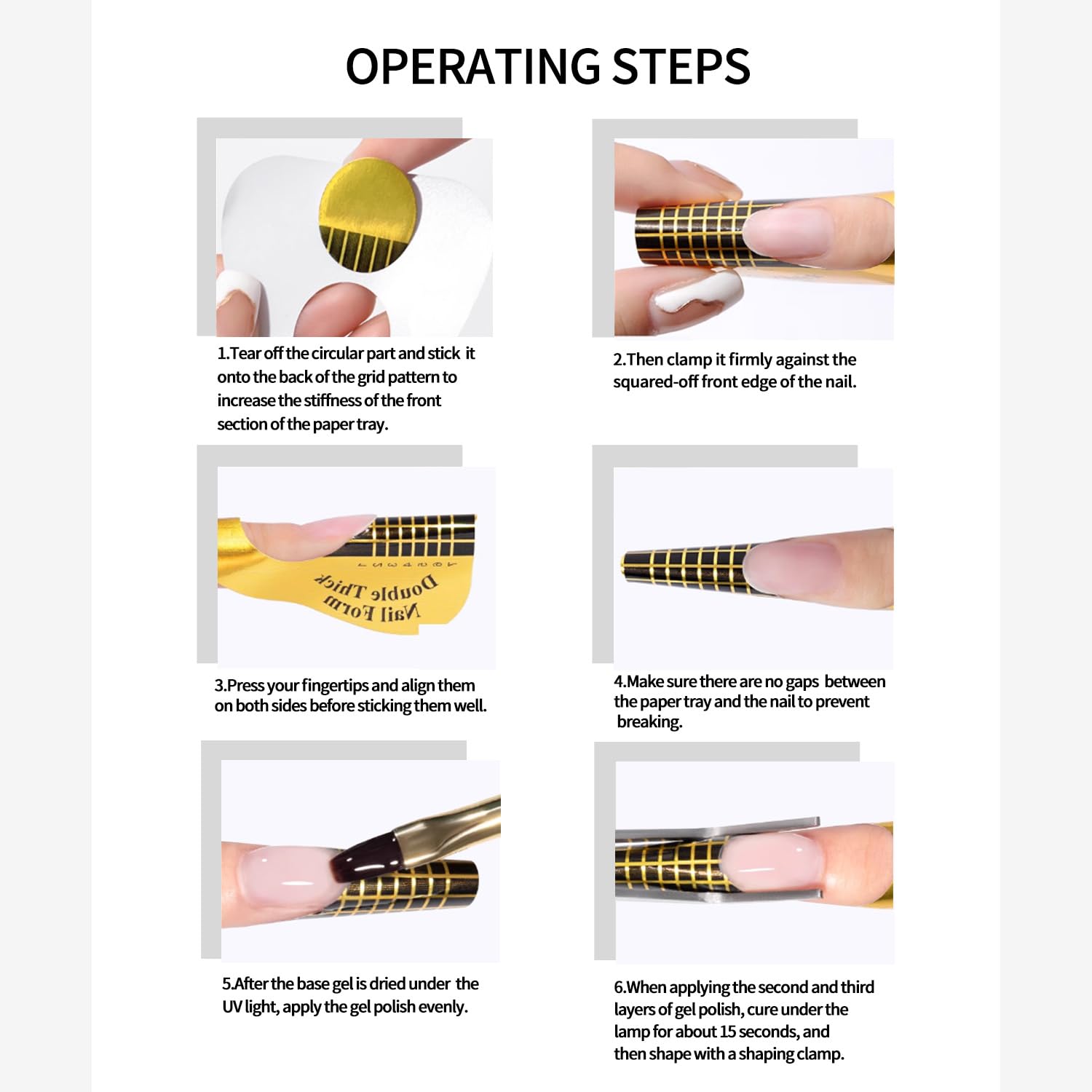 - Easy to Use Nail Extension Forms:Tear off the circle and snap the acrylic nail forms onto the front edge of the nail, pressing down on the sides.Tips:Don't leave gaps where the builder gel nail forms tray meets the nail to avoid gel leakage.