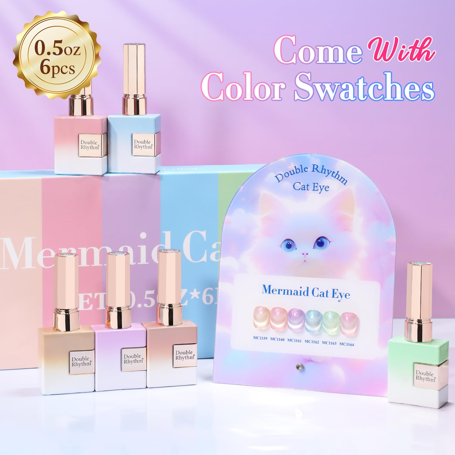 Double Rhythm Cat Eye Gel Nail Polish Set of 6 Same Color Same Bottle 0.5 Oz Shimmer Glitter with Magnet Holographic Reflective Magnetic UV Nail Polish Kit at Home (Nude Pink Green Purple-T6-29)
