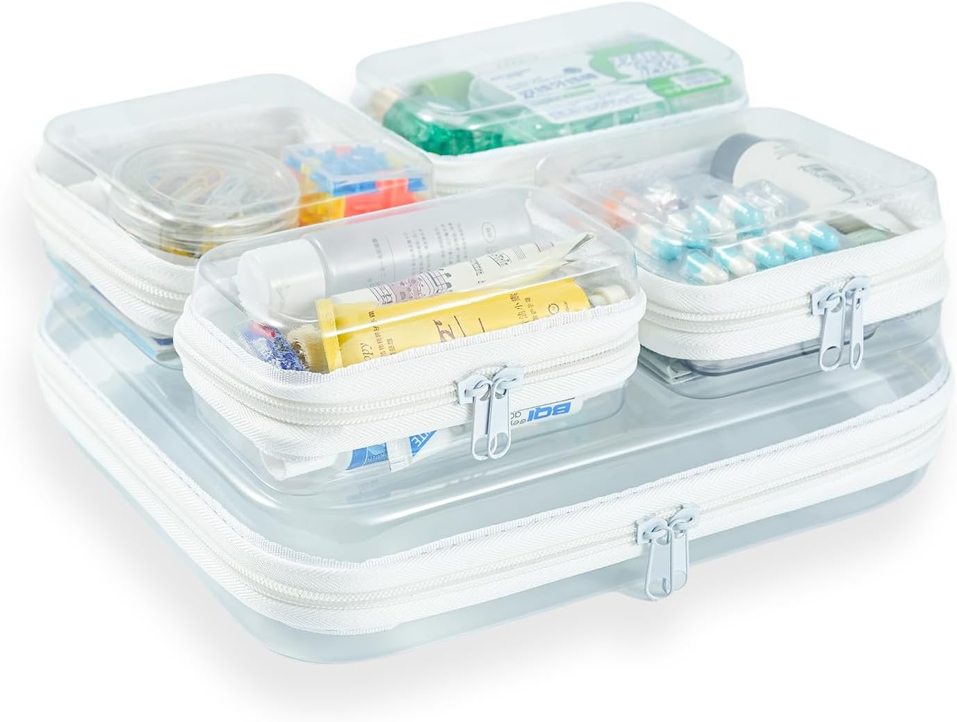 - Durable Stackable Design This hard shell zipper case set features a rigid, protective structure that stacks neatly without crushing the contents inside. Ideal for compact storage in suitcases, tote bags, or drawers. The set includes one medium zipper case (10 x 8.3 x 2.4 inches), two mini square cases (4 x 4 inches), and two extra-small pouches (5 x 2.7 inches).