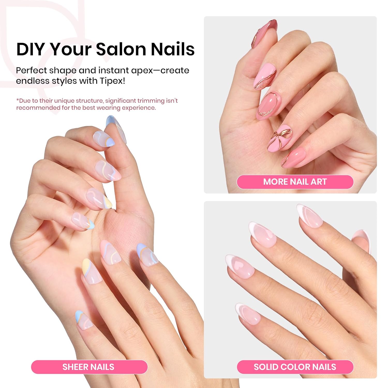 - WARM TIPS: Beetles Tipex tips are designed with a thicker, structured shape to deliver a strong apex and salon-level hold. They’re best suited for NAIL PROFESSIONALS or EXPERIENCED USERS who are familiar with Tipex pre-etched, pre-building tips. For optimal results, we highly recommend using solid nail glue to ensure a secure and even application. Not ideal for beginners or those preferring thin, flexible tips.