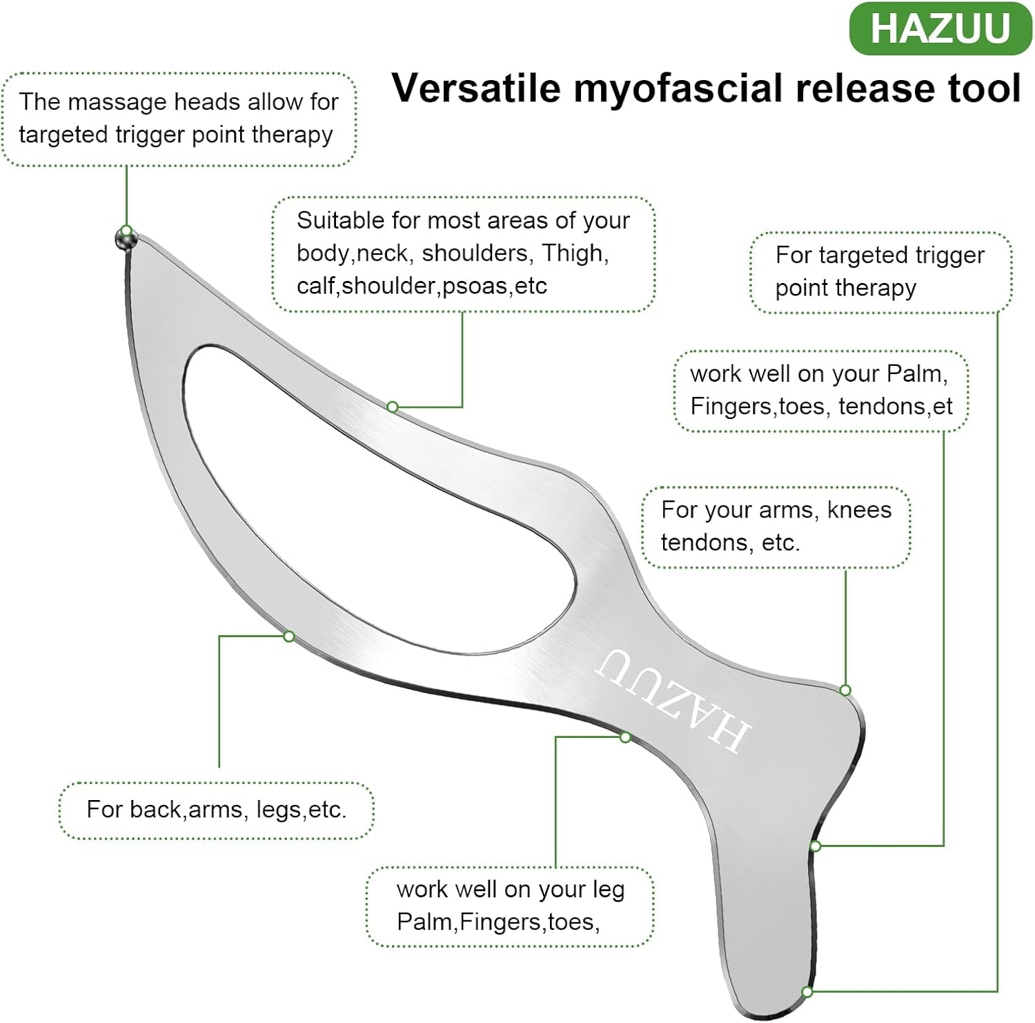 - 4. Efficient Massage Heads: Our stainless steel tool features massage heads that efficiently target body parts, allowing for targeted trigger point therapy, improved blood circulation, and tension relief.