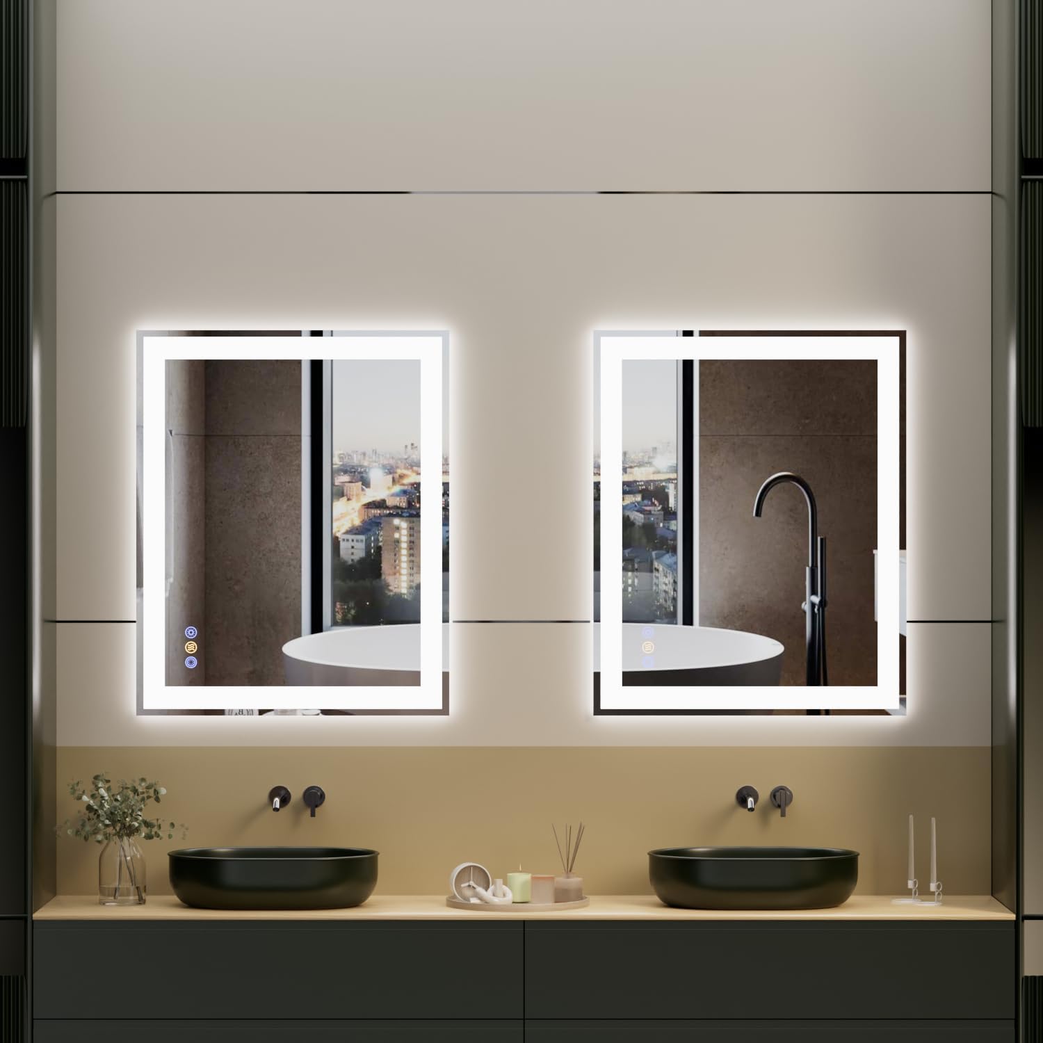 - 【Separate Front & Backlit Control with Dimming】This LED bathroom mirror features 3 adjustable color temperatures (3000K / 4000K / 6500K) and dimmable brightness (10%–100%). Front and back lights can be controlled separately. Short press to switch color temperature and turn lights on/off. Long press to adjust brightness. Unlike most mirrors, our button light can be turned off — no more glowing at night