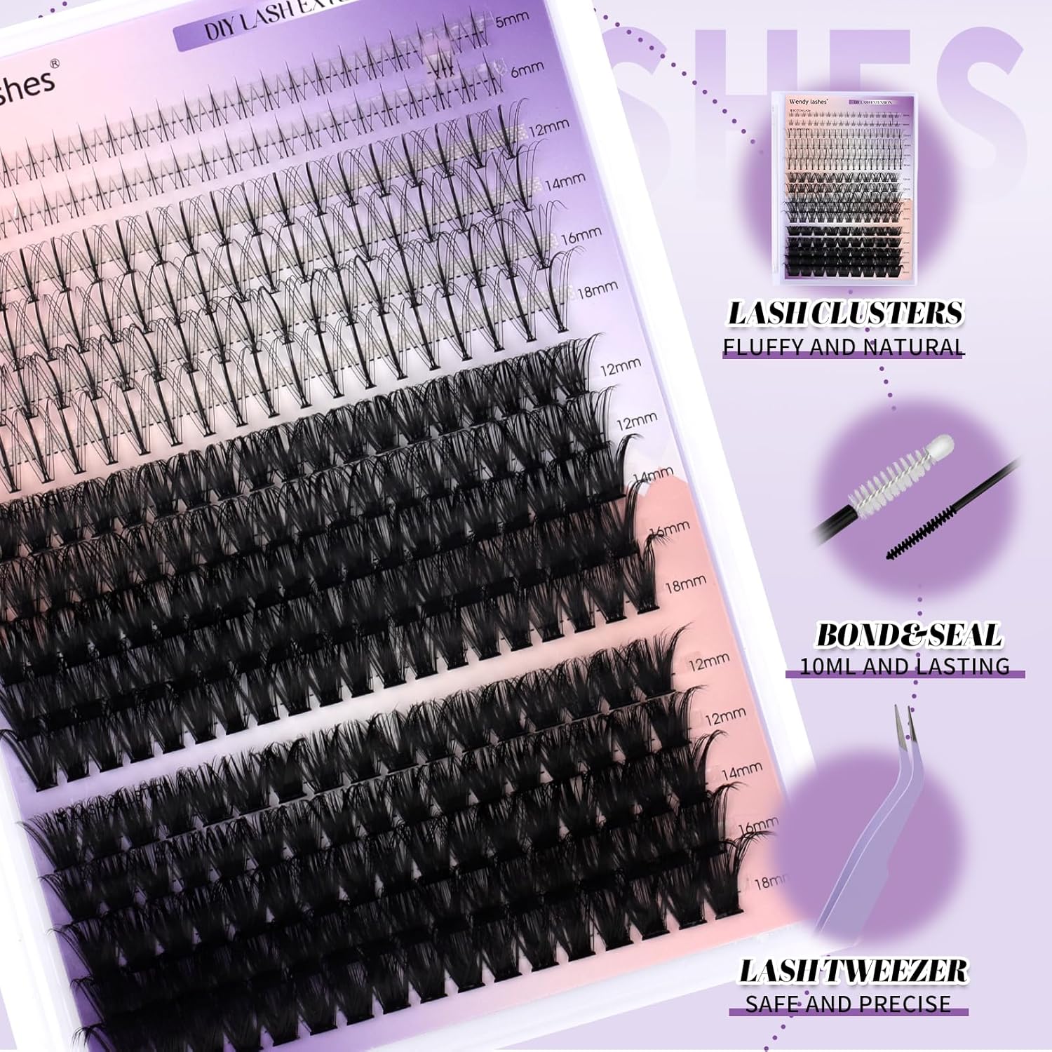 - DIY Reusable Cluster Eyelash Extensions Kit: Easy to wear,use tweezers to gently roll the eyelash straps down; Application of bonding; Place lash lash lash; Use an eyelash seal brush to lock,suitable for beginners and makeup enthusiasts. With proper care,eyelashes can be reused 3-5 times for environmental hygiene.