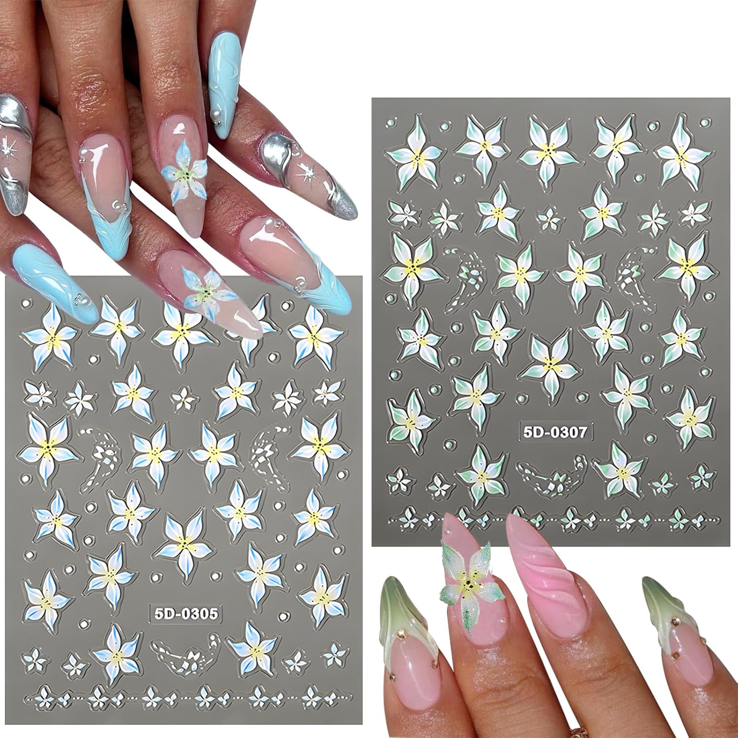 Flower Nail Stickers for Nail Art 5D Embossed Nails Decals Spring Summer Lily Decoration for Women Nails Design 3D Self Adhesive Pink Blue Green Flower Supplies