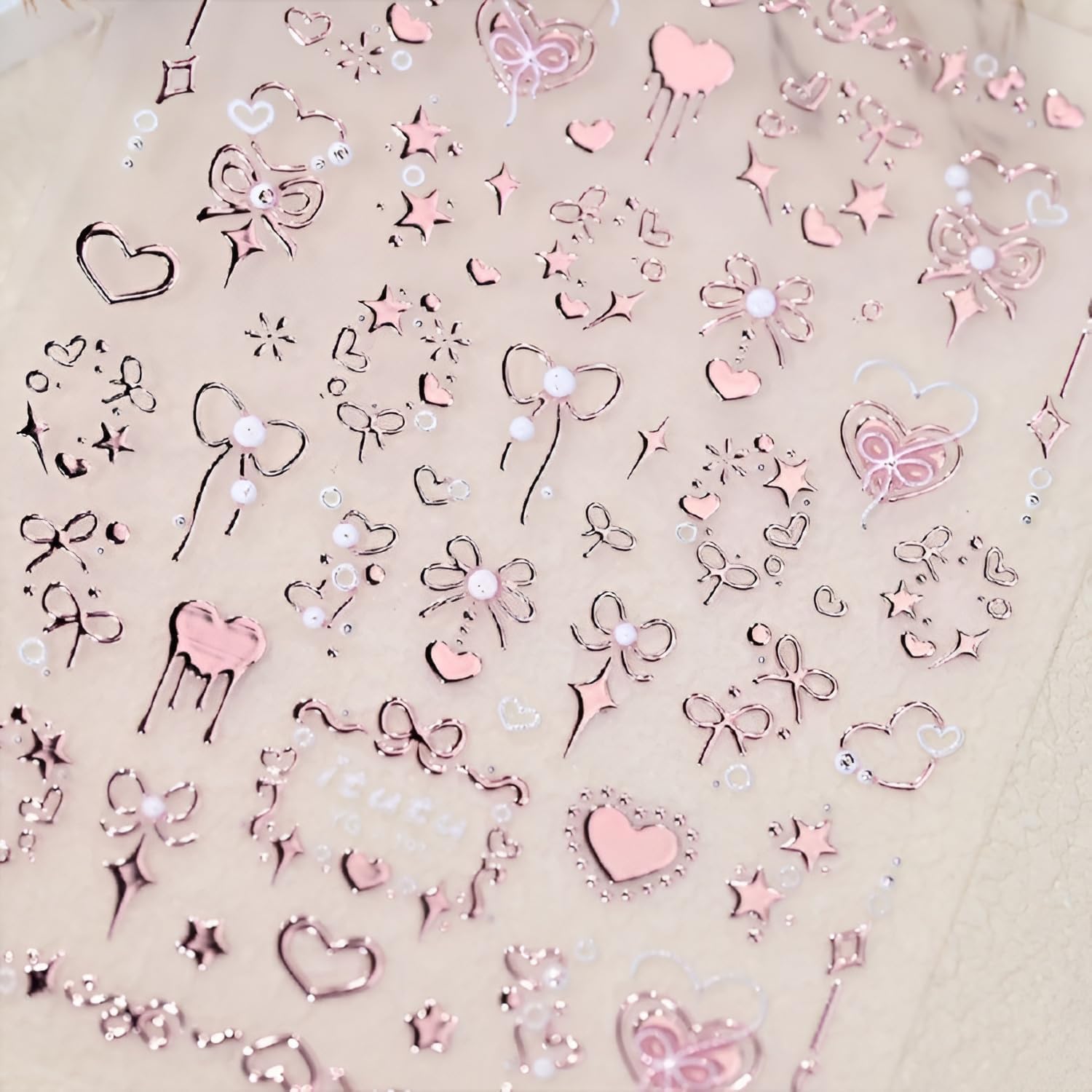 Pink Heart Nail Art Stickers Decals 5D Embossed Star Nail Stickers for Nail Art Pink Bow Nail Decals Valentine Nail Design Cute Nails Supplies for Women