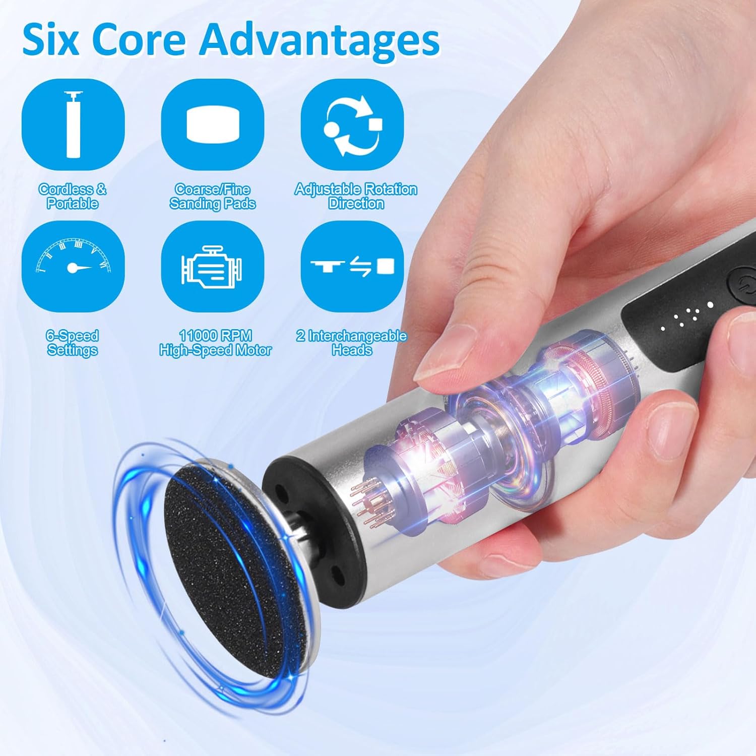- 【Professional-Grade Care】: Our electric callus remover is equipped with 2 premium metal heads (Callus/Nail Modes), offering a dual-use design that provides salon-quality foot care smoothness without the high cost. We also include 3 types of interchangeable sandpapers to meet different needs while eliminating the risk of cross-contamination.