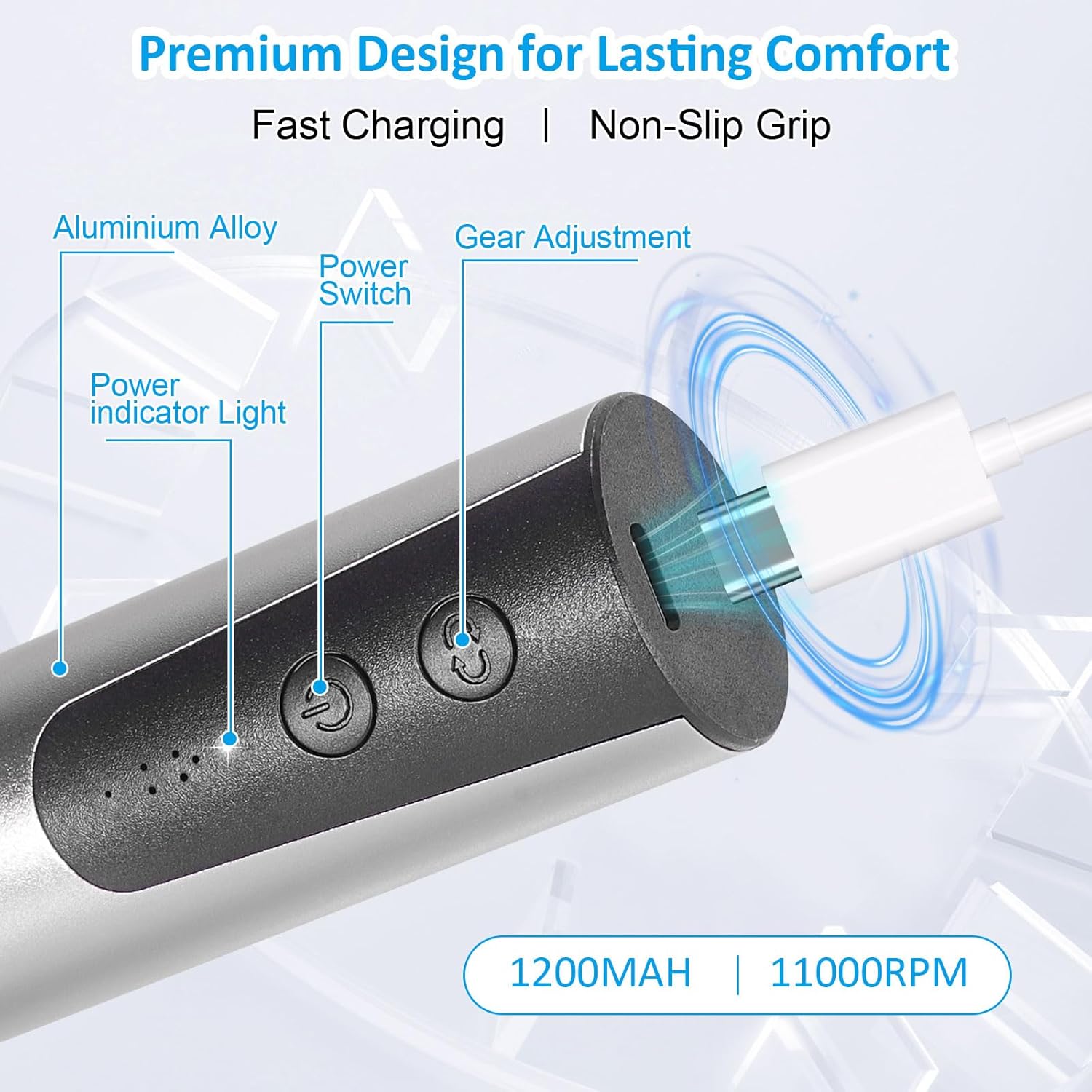 - 【Package Includes】: 5.9-inch device × 1,USB charging cable × 1,Premium metal heads × 2 (Callus mode / Nail mode),80 grit for calluses ×10,120 grit for sensitive areas ×10,Ring sandpaper for nail polishing × 10,User manual × 1