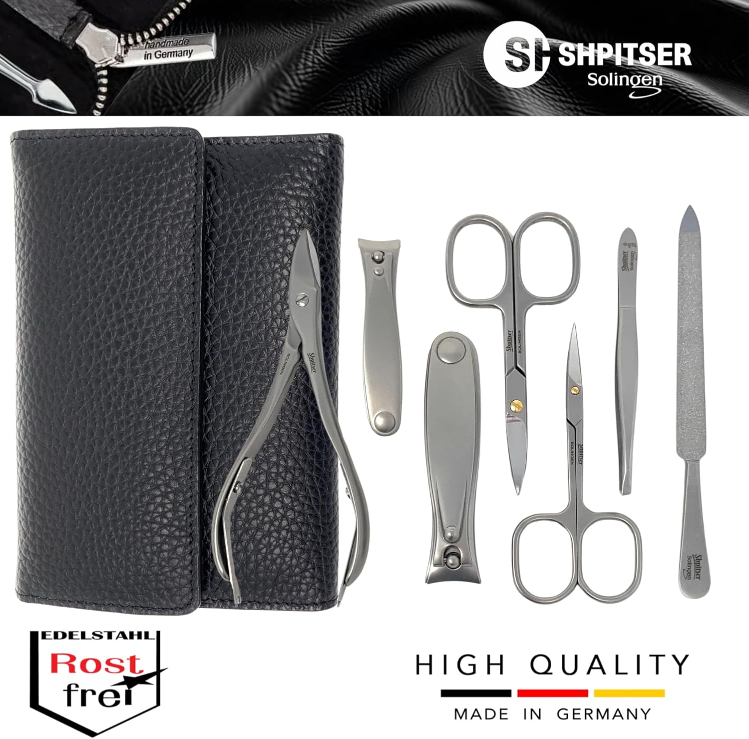 - GUARANTEED FOR LIFE β Shpitser manicure instruments are securely housed in premium-quality sets, offering optimal protection for these precision tools. Crafted from the finest leather with excellent workmanship, they ensure durability and a lifetime of reliable use.