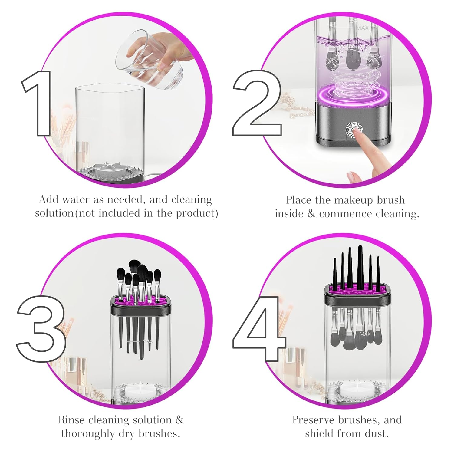- Itโs Easier Than You Think: Simply add water and cleaning solution, insert your brush. After cleaning, rinse the brush and dry it, then insert it in the brush cleaner to dry or let it air dry thoroughly. The brush cleaner also doubles as a brush holder, keeping your brushes organized and ready for use
