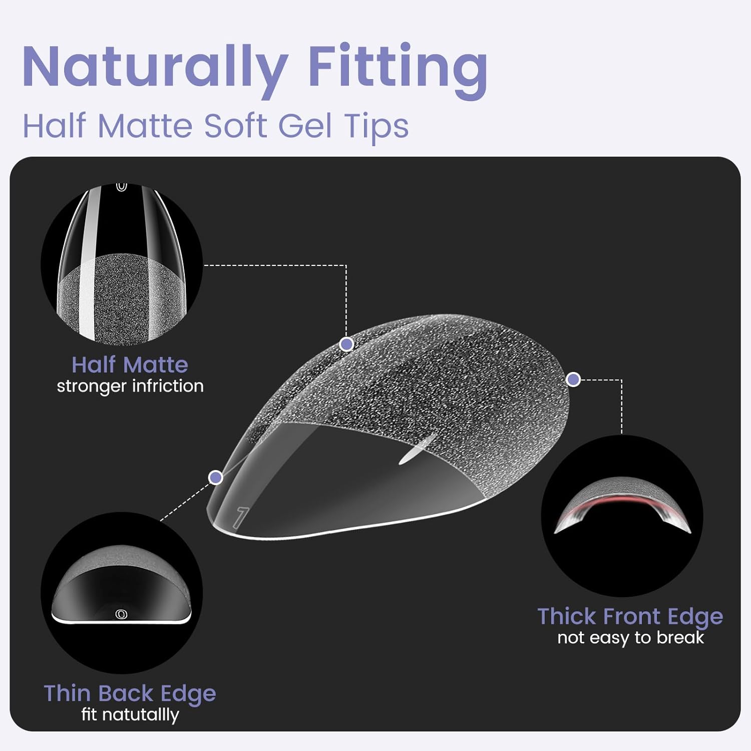 - Soft Gel Material for Comfort and Flexibility-Made from soft gel jelly, these nail tips almond offer a comfortable and flexible fit on your natural nails. designed to blend seamlessly with natural nails for a comfortable and natural look. Easily create stunning nail art by combining these tips with nail polish, impregnating powders, and acrylic powders, offering a salon-quality experience without the high costs